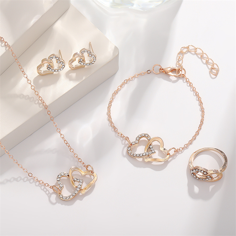 Moda 18K Ouro Coreia Corações Duplos Colar De Cristal Pulseira Brinco Anel Feminino Sorte Jóias Presente Do Dia Dos Namorados