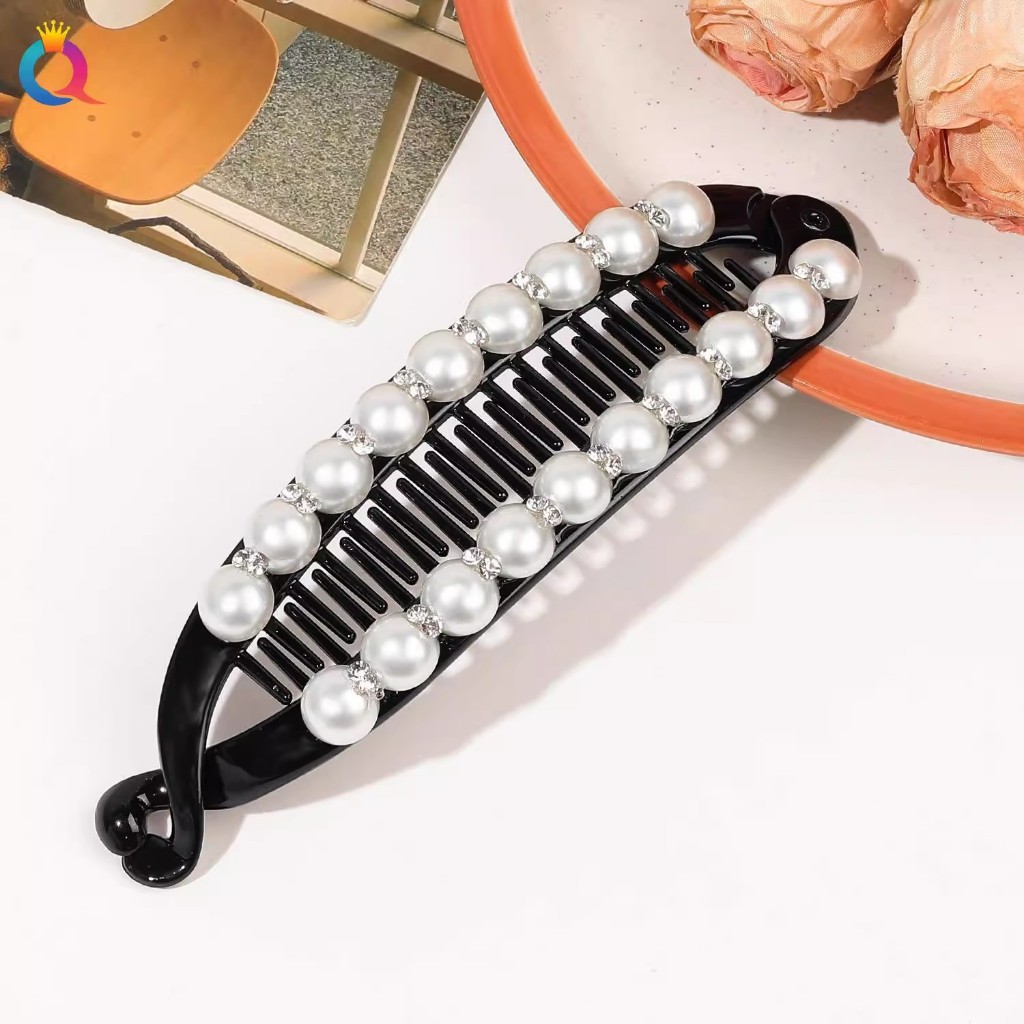 Moda elegante imitação de pérola diamante preto Vertical clipe de cabelo acrílico Banana clipe pente de cabelo feminino