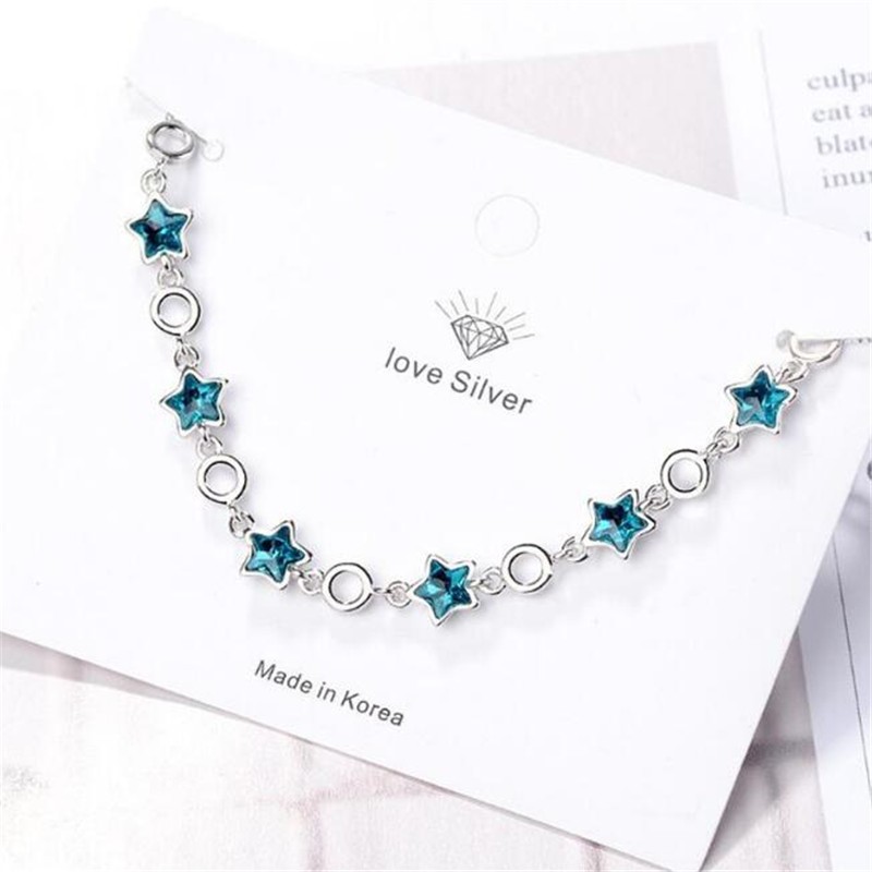 Moda Simples Pulseira de Prata 925 Libras Esterlinas Pulseira Azul Cinco Pontas Estrela Cristal Pulseira Classe Pulseira Mão Jóias Fofa Estrela Doce Jóias Feminina CB109