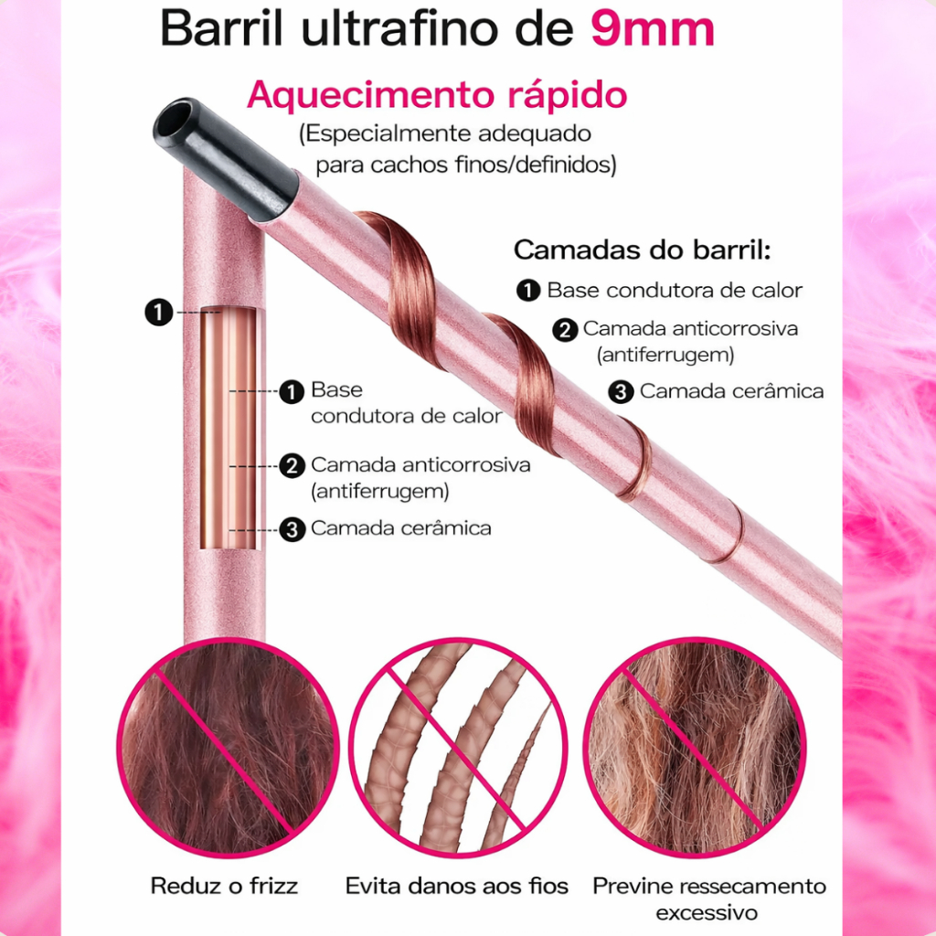 Voltagem: Bivolt 110-220V Potência: 25W Atenção: O modelo enviado acompanha pinça de fixação, conforme lote atual do fabricante. A pinça não altera o funcionamento do produto, apenas auxilia no manuseio. Obs: O modelador é enviado em cor aleatória, conforme disponibilidade em estoque no momento da separação do pedido. O Modelador de Cachos é ideal para quem busca cachos definidos e duradouros com resultado de salão. Seu barril ultra fino de 9 mm com revestimento cerâmico de turmalina distribui o calor de forma uniforme, evitando danos e garantindo brilho aos fios. Cachos definidos e com efeito natural Revestimento cerâmico que protege o cabelo Aquecimento rápido e bivolt automático Cabo giratório 360° para facilitar o uso Design leve e ergonômico