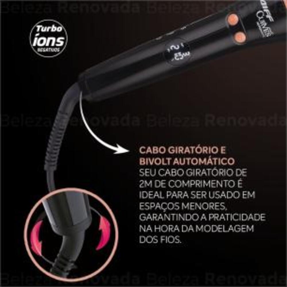 Babyliss automático Taiff Modelador Curves Rotativo CachosDescrição do ProdutoAgora ficou mais fácil e seguro modelar os cabelos em casa e obter resultado de salão! A Taiff inovou mais uma vez, e quem ganha é você, que agora tem em mãos um modelador automático que oferece muito mais segurança e praticidade na hora de modelar os cabelos em casa. E tudo isso com a tecnologia Turbo Íon, que libera milhões de íons pelas quatro saídas do tubo que entram diretamente em contato com o seu cabelo, deixando-o com muito mais brilho e menos frizz. Modele cachos e mechas automaticamente Graças à sua haste giratória e ao tubo de 32 mm (1 ¼”), que garante versatilidade. O novo Modelador Curves Automatic, da Taiff, ainda vem com visor digital e seletor de temperaturas com três opções: 170 °C, 190 °C e 210 °C. Liberdade em todos os sentidos O Novo Modelador Curves Automático, da Taiff, tem sistema giratório que é controlado por dois botões, possibilitando a criação de cachos perfeitos em diferentes sentidos. Além disso, tem cabo giratório de 2,5 m, garantindo praticidade na hora da modelagem. E, como ele é bivolt, você pode levá-lo a qualquer lugar! Atributos do ProdutoMarca: Taiff Modelo: Modelador Cachos Cacheador Curves Ondulador Taiff Por que escolher o Babyliss automático Taiff Modelador Curves?O Babyliss automático Taiff Modelador Curves é a escolha ideal para quem busca praticidade, segurança e resultados profissionais em casa. Com tecnologia Turbo Íon, visor digital, seletor de temperaturas e sistema giratório, este modelador oferece tudo o que você precisa para criar cachos perfeitos e duradouros. Garanta já o seu Babyliss automático Taiff Modelador Curves!Não perca mais tempo e mesmo o Babyliss automático Taiff Modelador Curves para ter cabelos deslumbrantes todos os dias. Transforme sua rotina de beleza com praticidade e resultados incríveis. ! ``` Garanta já o seu Babyliss automático Taiff Modelador Curves! Transforme sua rotina de beleza com praticidade e resultados incríveis. !