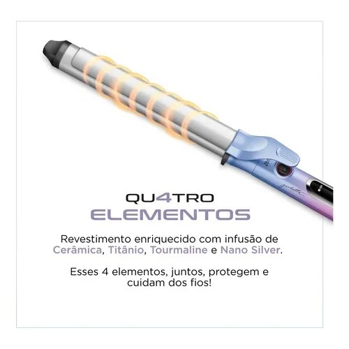 DESCRIÇÃO RESUMIDA O Modelador de Cachos da Linha by Juliette Qu4tro Elementos traz um revestimento especial enriquecido com infusão de Cerâmica, Titânio, Tourmaline e Nano Silver. Esses 4 elementos, juntos, protegem seus fios e garantem uma aparência mais saudável aos cabelos, com brilho intenso, maciez e sem frizz. Características: - Marca: Mondial - Modelo: MC-JU-03 Especificações: - Cor Rosa com Azul - Controle de temperatura 120°C a 220°C - Tubo com diâmetro de 28mm - Tubo mais longo - Painel digital - Bivolt - Cabo giratório - Comprimento do cabo 2,5m - Dimensões 6x38x3cm (AxLxC) Garantia: - 12 Meses Conteúdo da embalagem: - 1 x Modelador de cachos - 1 x Manual de instruções Peso - 0,340g