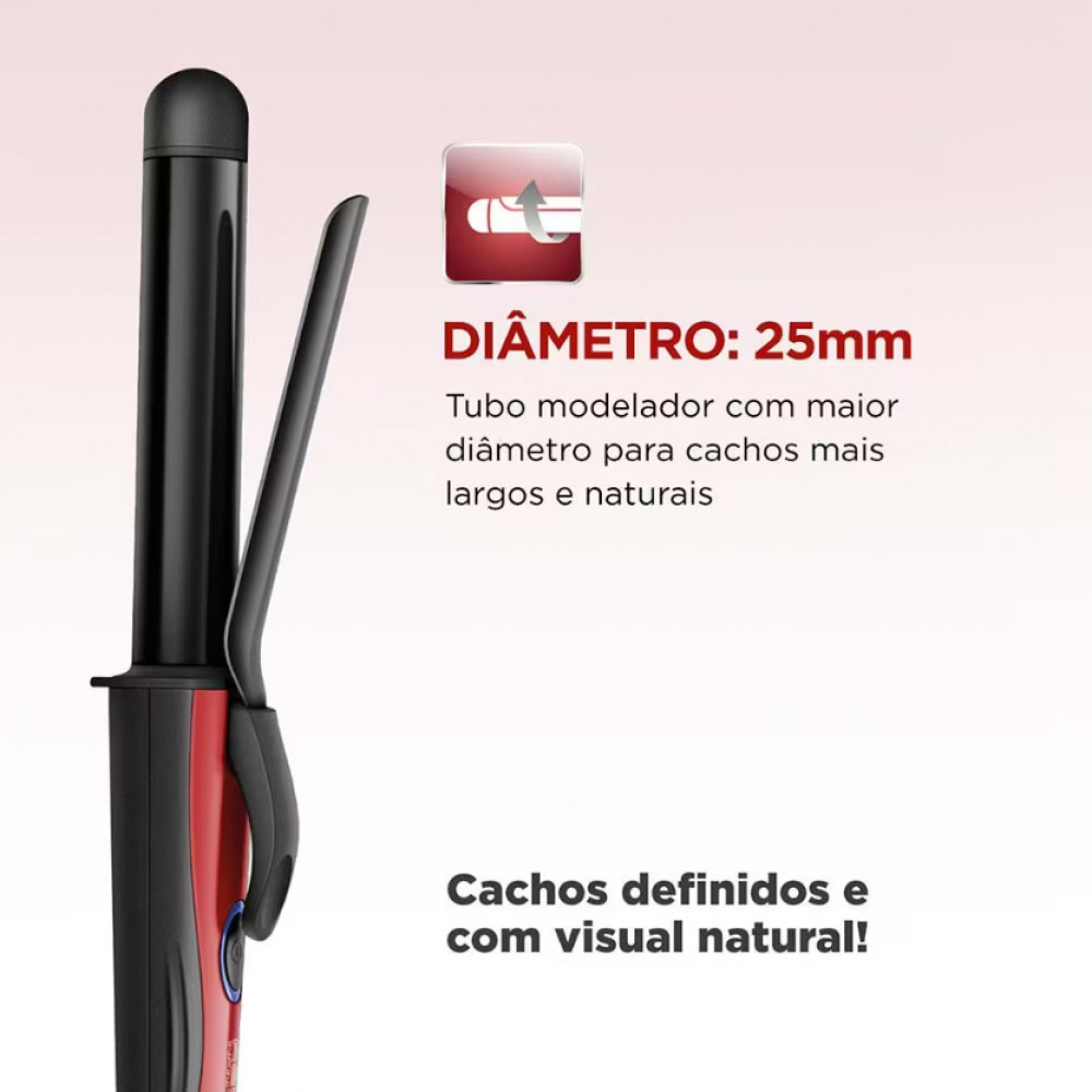 Modelador de Cachos Mondial Red Infinity EM-12: Cachos Largos e Naturais com Proteção e Praticidade! Conquiste um visual deslumbrante e moderno com o Modelador de Cachos Red Infinity EM-12 da Mondial. Projetado para quem busca praticidade e resultados profissionais, este modelador garante cachos incríveis, largos e com aparência natural graças ao seu tubo modelador com diâmetro de 25mm. Sua tecnologia de Revestimento Cerâmico é essencial para a saúde dos fios. Ela distribui o calor de forma uniforme, garantindo proteção máxima durante a modelagem, além de um acabamento duradouro, com brilho intenso e zero frizz. A temperatura constante de 210ºC é ideal para modelar rapidamente qualquer tipo de cabelo. Com a facilidade do sistema BIVOLT, você pode levar seu Modelador Mondial para qualquer lugar (127V e 220V). A segurança e o conforto também são prioridades: o Cabo Giratório 360° oferece total liberdade de movimento, enquanto o Suporte de Apoio permite que você descanse o aparelho com segurança durante o uso. Red Infinity: a combinação perfeita de tecnologia e beleza para seus cachos! Destaques do Modelador Mondial Red Infinity EM-12: Tubo de 25mm de Diâmetro: Ideal para criar cachos mais largos, soltos e com aspecto super natural. Revestimento Cerâmico: Distribuição uniforme do calor que protege os fios, garantindo cachos brilhantes e sem frizz. Temperatura de 210 graus: Temperatura constante e elevada, perfeita para modelar com rapidez e eficácia. Cabo Giratório 360 graus: Maior autonomia e facilidade no manuseio, evitando que o fio enrole. Suporte de Apoio: Proporciona mais segurança ao apoiar o modelador durante o uso. Aproveite e conheça mais produtos para cuidar dos seus cabelos e deixe seu momento de auto cuidado completo! Características Gerais: Revestimento cerâmico: distribui o calor por igual, garantindo a maior proteção dos fios Cachos definidos e visual natural Temperatura 180ºC Suporte de apoio- Cabo giratório Controle de temperatura: não Lâmpada piloto: não P/ cabelos úmidos: não Emite íons: não Visor LCD: não Fio giratório: sim Ideal para Cachos: Pequenos, Médios ,Grandes Consumo (kw/h): 0,055kW/h Temperatura máxima (°C): 180 graus Comprimento do fio: 1,80 m Tipo de Tomada: 10A (4mm) Tipo de Plugue: 2 Pinos Conteúdo da Embalagem: 01 modelador, manual de instruções. Garantia do Fabricante: 12 meses