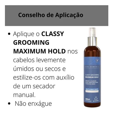 GRANDHA VITA HOMINIS CLASSY GROOMING MAXIMUM HOLD 290ML Estilizador e modelador térmico, potencializa brilho e volume dos cabelos. O “Grooming” é uma modalidade de estilizador e finalizador para os cabelos, praticamente um gel líquido de alta fixação para os cabelos. Este é um produto referência para os barbeiros. Modelador e estilizador técnico de alto desempenho, provê brilho e volume aos cabelos. Destaca-se por seus polímeros nobres e uma fragrância rebuscada, apoiada em concentrações personalizadas dos óleos essenciais de sândalo e patchouli. Toque determinante para destacar volume e força dos cabelos do homem urbano. Conselho de Aplicação: Aplique o CLASSY GROOMING MAXIMUM HOLD nos cabelos levemente úmidos ou secos e estilize-os com auxílio de um secador manual. Não enxágue. A LINHA VITA HOMINIS é a linha masculina da GRANDHA para barba e cabelo. A verdadeira essência do homem, traduzida numa experiência elegante e sofisticada baseada em ativos naturais como óleos essenciais e extratos vegetais, ativos de alta tecnologia e performance. INFORMAÇÕES IMPORTANTES Certificado pela ABT - Academia Brasileira de Tricologia. Dermatologicamente testado. Estilizador e modelador térmico, potencializa brilho e volume dos cabelos. Não testado em animais. Quem somos nós: A Locus é uma loja online, que oferece produtos nacionais e importados , temos orgulho desse sucesso e hoje conquistamos clientes em todo o Brasil, o resultado para nosso sucesso é simples, entregamos exatamente o que prometemos para atender todas as expectativas dos nossos clientes. Servir bem, para servir sempre... Obrigada!!!