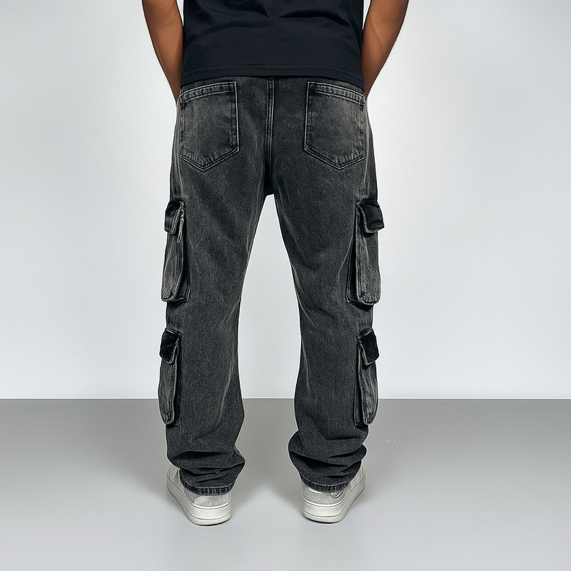 Modelo Novo Calça Cargo Masculina Jeans Preto Lavado Estonado Original Reta Solta 8 Bolsas
