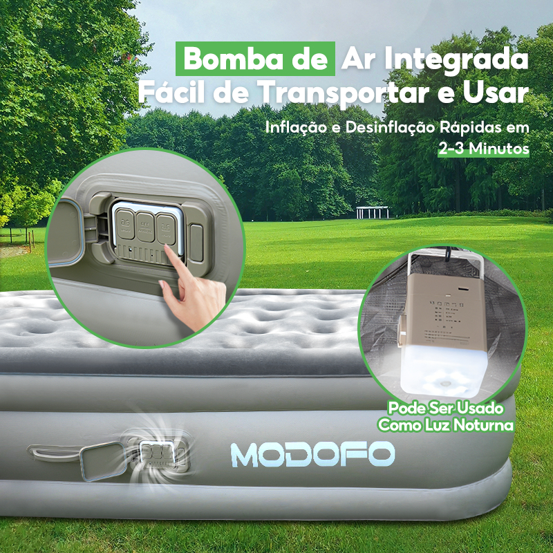 Modofo Colchão Inflável Automático solteiro/Queen/King Colchão Casal inflável Com Bomba Embutida Camping Equipment Bege/Cinza azulado/Verde 500KG (Solteiro:195*100*40cm) (Queen:200*150*40cm) (King: 200*180*40cm) (Solteiro195*100*25cm) (Queen:200*152*25cm) (King: 200*180*25cm) Bateria de lítio recarregável e removível Bomba de ar Em comparação com outras marcas de colchões infláveis no mercado, o nosso colchão possui uma bomba de ar com bateria de lítio sem fios de 4000 mAh, eliminando as preocupações com a fonte de alimentação. Quer pretenda aproveitar o sol de inverno no jardim ou acampar ao ar livre no verão, ele satisfaz as suas necessidades. Inflagem automática rápida: com um único toque, o colchão inflável infla em 3 minutos. A bomba integrada oferece um funcionamento mais silencioso e sem esforço. A bolsa de transporte incluída garante fácil armazenamento e transporte. Durável, impermeável e com regulação de temperatura Fabricado em PVC robusto com uma parte superior impermeável com acabamento em veludo, o nosso colchão possui tecnologia multicamadas com resistência a furos. Este design ajuda a regular a temperatura corporal para uma respirabilidade ideal. Base antiderrapante com tecnologia respirável O design patenteado da base estável com ventosas evita que o colchão duplo escorregue ou deslize acidentalmente. Colchão king size para máximo conforto As dimensões totalmente infladas são 200*180*40 cm. A estrutura da superfície alivia vários pontos de pressão, suportando até 500 kg para um apoio personalizado e uma experiência de sono com gravidade zero. Compatível com qualquer lençol king size. Cenários adequados Este colchão de ar com bomba de bateria de íon-lítio integrada é ideal para acampar, uso doméstico, hóspedes, viagens portáteis ou como um presente distinto e prático para homens ou mulheres. Se você tiver alguma dúvida ou preocupação sobre o produto, antes ou depois da compra, não hesite em entrar em contato comigo. Responderei em até 24 horas. Lista de produtos: 1*colchão inflável King 1*Bomba de ar com bateria de lítio 3*Bicos cônicos de tamanhos diferentes 1*bolsa de armazenamento 2*Travesseiro inflável 1*kit de reparo 1*cabo de carregamento USB 1*Manual de instruções