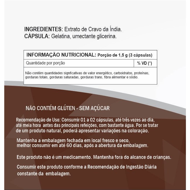 Somos Distribuidores Oficiais de diversas marcas de Excelência e Qualidade! Nosso Objetivo de garantir satisfação total de nosso cliente, com produtos de Excelência e Qualidade para o seu dia a dia, buscando sempre proporcionar a melhor experiência tanto nos produtos quanto no atendimento. Sua satisfação também é a nossa! Todos os produtos acompanham NOTA FISCAL, e nós garantimos sua PROCEDÊNCIA! Agradecemos a visita e esperamos que volte mais vezes. IMPORTANTE: Produto autorizado para comercialização em todo o território nacional através do anexo I da RDC 240/2018, em conformidade com a RDC 27/2010 e RDC 23/2000 da ANVISA. VALIDADE DO PRODUTO As validades dos produtos até 24 meses! INGREDIENTES: ModoVida CravBio - natuverdemax NÃO CONTÉM GLÚTEN 60 cápsulas 90 cápsulas 120 cápsulas Contém 500 mg por cápsula. Consumir uma cápsula três vezes ao dia, 1 Cápsula antes das refeições.