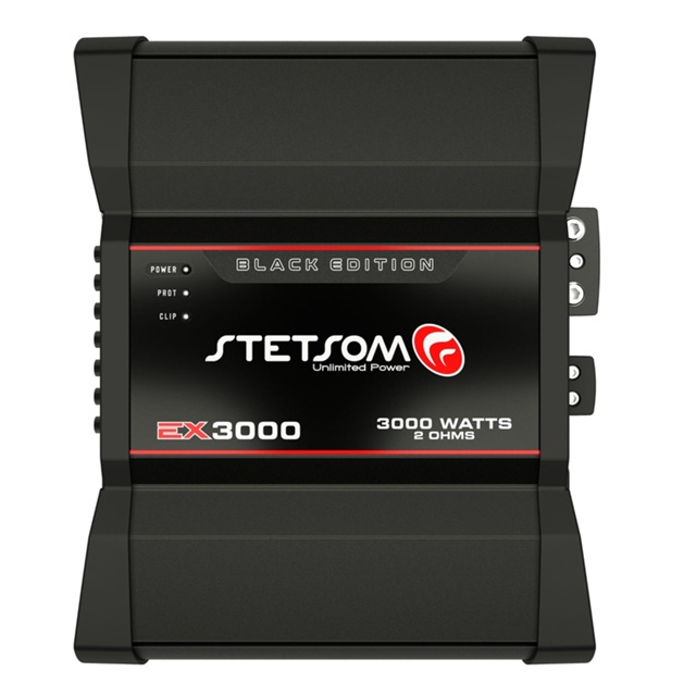 O módulo amplificador Ex 3000 Black edition foi projetado para amantes de som automotivo que procuram fidelidade sonora em alta performance. Perfeito para a instalação de woofers, subwoofers, drivers e tweeters. Com um pouco mais de 2kg o módulo é leve e econômico, ideal para alta performance e durabilidade de som. Segue os dados: O Amplificador Stetsom Ex 3000 Black Edition possui tecnologia Digital proporcionando baixo consumo de bateria em seu sistema de som automotivo. Tem potência de 3000w rms e até 3700w rms de potência máxima à 14,4v (com o carro ligado ou com o uso de fonte/carregador). Especificação Técnica • Potência RMS em 2 Ohms 12,6V: 3000W • Potência RMS em 4 Ohms 12,6V: 2000W • Potência RMS em 2 Ohms 14,4V: 3700W • Potência RMS em 4 Ohms 14,4V: 2500W • Tensão de Alimentação: 9V ~ 16V • Resposta em Frequência: 10Hz ~ 20KHz • Crossover Low Pass: 90Hz ~ 20KHz • Crossover High Pass: 10Hz ~ 700Hz • Relação Sinal Ruído: >90dB • Sensibilidade de Entrada: 200mV • Impedância de Entrada: 9K Ohms • Impedância Mínima de Saída: 2 Ohms • Consumo com Sinal Musical: 150A • Consumo com Sinal Bass: 300A