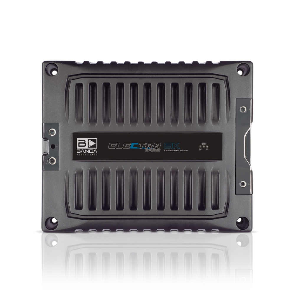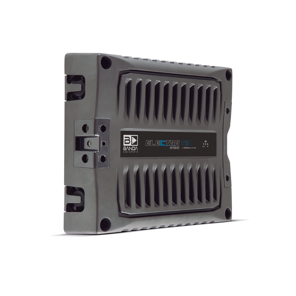 A linha ELECTRA foi desenvolvida especialmente para quem busca um grave incomparável. Possui uma resposta de frequência de 5 a 500Hz (-3dBs). Devido à isto, o ELECTRA irá tocar apenas Subwoofers, Graves. O recurso BASS BOOST @ 45Hz é um diferencial, reforçando ainda mais os graves do seu sistema. Projetado em um chassi 100% em alumínio, trabalha com potência de 8000 WRMS com 1 canal de entrada para ligação e impedância de 1 Ohm ou 2 Ohms. Possui baixíssima distorção harmônica (menor que 1%) e indicador de Clipping, ventilação forçada e proteção contra curto circuito. Potencia RMS: Modelo 8k1 @ 1 Ohm • 12,6V 1ohm - 8000Wrms • 12,6V 2ohms - 5350Wrms Modelo 8k2 @ 2 Ohms: • 12,6V 2ohms - 8000Wrms • 12,6V 4ohms - 5350Wrms • Classe de operação: Classe D • Eficiência: 8k1 76% / 8k2 79% • Tensão de Entrada: 9 - 15V • Impedância de Entrada: 100K Ohms • Distorção Harmônica Total + Ruído: <1% • Sensibilidade de Entrada: ~150mV - 8V • Relação Sinal Ruído: 80dBs • Resposta em Frequência: 16Hz a 500Hz (-3dB) • HPF: 16Hz - 100Hz • LPF: 80Hz - 500Hz • Bass Boost: 30Hz a 80Hz 0 a +12dB • Fusível Recomendado: 2 x 225A • Corrente de Repouso: 3A • Corrente Máxima (sinal musical): 850A • Cabos de Alimentação (mín. recomendado): 2 x 50mm Dimensões • Peso: 6,3kg • Altura: 7,3 cm • Largura: 25,6 cm • Profundidade: 31,7 cm