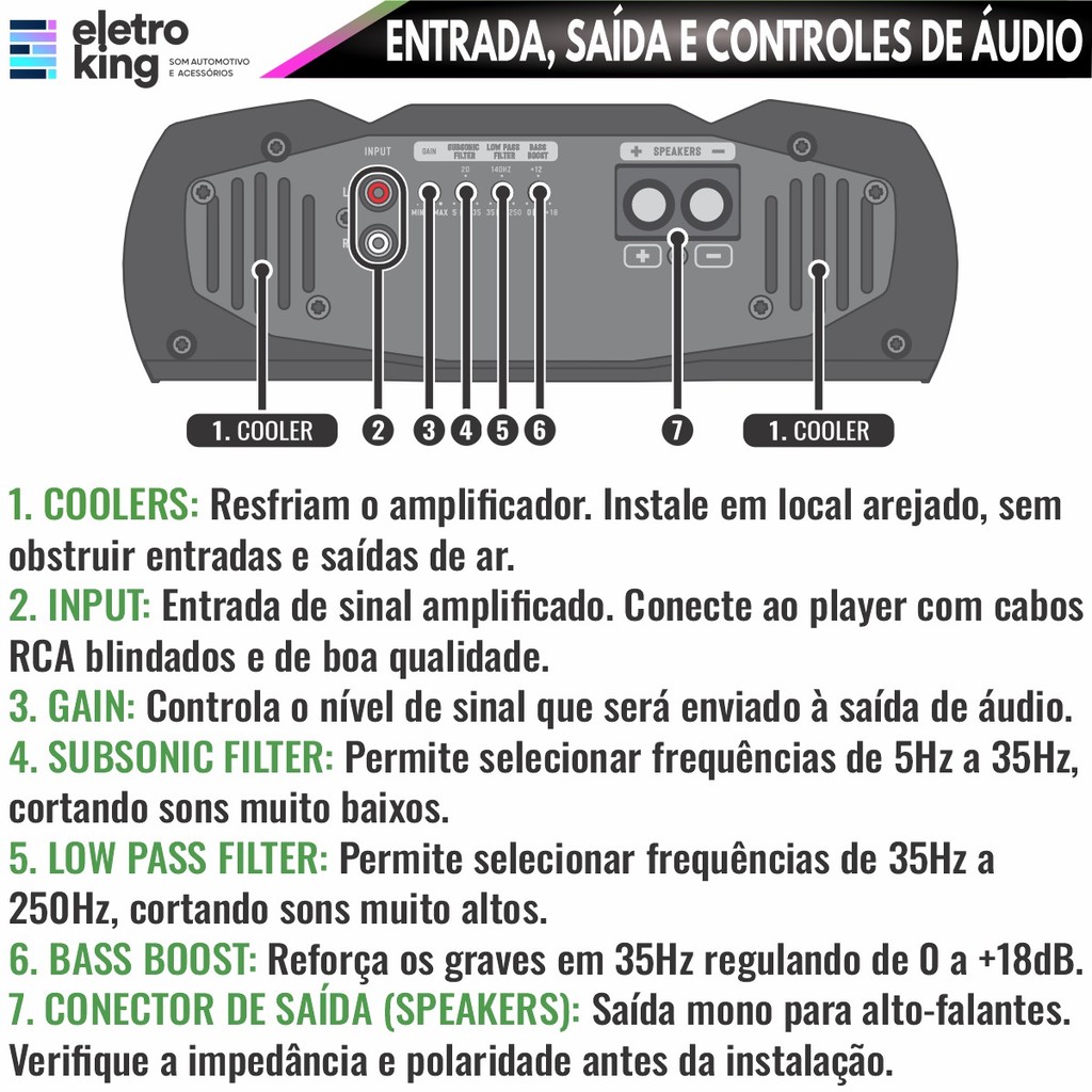 Módulo Amplificador Stetsom Digital Bass DB3000 1 Canal 3000 Watts RMS - 2 Ohms O Módulo Amplificador Stetsom Digital Bass DB3000 entrega impressionantes 3000 Watts RMS em 1 canal a 2 Ohms, sendo ideal para sistemas de som automotivo que exigem potência e qualidade sonora. Projetado para subgraves e pancadões, ele conta com tecnologia digital de alta eficiência, resposta rápida e controle preciso, garantindo graves impactantes com máxima fidelidade. Especificações Técnicas: • Marca: Stetsom • Modelo: Digital Bass DB3000 • Número de canais: 1 • Potência RMS em 2 ohms (12,6V): 3000W • Potência RMS em 4 ohms (12,6V): 2000W • Potência RMS em 2 ohms (14,4V): 3700W • Potência RMS em 4 ohms (14,4V): 2350W • Tensão de alimentação: 9V ~ 16V • Resposta em frequência: 5Hz ~ 250Hz • Crossover low pass: 35Hz ~ 250Hz • Crossover high pass (subsonic): 5Hz ~ 35Hz • Relação sinal/ruído: >90dB • Sensibilidade de entrada: 200mV • Impedância de entrada: 20K ohms • Consumo com sinal musical: 147A • Consumo com sinal bass: 295A • Dimensões (A x L x C): 78 x 231,5 x 276 mm • Peso: 3,1 kg Entrada, saída e controles de áudio. • INPUT: Entrada do sinal que será amplificado. Conecte ao rádio/player através de cabos RCA blindados e de qualidade para evitar ruídos indesejados. • GAIN: Controle do nível de sinal na entrada do amplificador que será enviado para a saída de áudio. • SUBSONIC FILTER: Controle variável que permite selecionar a frequência inicial de 5Hz a 35Hz que será reproduzida pelo amplificador. • LOW PASS FILTER: Controle variável que permite selecionar a frequência final de 35Hz a 250Hz que será reproduzida pelo amplificador. • BASS BOOST: Reforço de graves fixo em 35Hz com atuação regulável de 0dB a +18dB. • CONECTOR DE SAÍDA (SPEAKERS): Saída MONO do sinal amplificado para conexão dos alto-falantes. Verifique a impedância miníma e polaridades antes de realizar a instalação. Conteúdo da Embalagem: • 01 Módulo Stetsom Digital Bass DB3000 1 Canal 3000W - 2 Ohms Importante: • Garantia de 273 Dias. • Valor Unitário.
