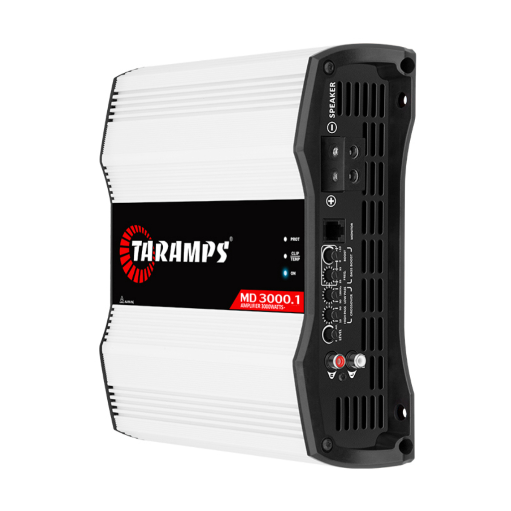 Módulo Amplificador Taramps MD 3000.1 – 3000W RMS (1 ohm, 2 ohms ou 4 ohms) O Taramps MD 3000.1 é um amplificador mono de alto desempenho, projetado para quem busca potência, eficiência e qualidade sonora em sistemas de som automotivo. Com tecnologia Classe D, ele entrega 3.000 W RMS a 12,6 VDC e oferece reprodução full range (10 Hz – 18 kHz), cobrindo desde os graves até os agudos com excelente fidelidade. Disponível nas versões 1 ohm, 2 ohms e 4 ohms, o MD 3000.1 se adapta facilmente a diferentes configurações de subwoofers e alto-falantes, garantindo máximo rendimento e estabilidade. Conta com ajustes precisos de ganho, filtros HPF e LPF variáveis, controle de Bass Boost, excelente relação sinal/ruído e múltiplas proteções eletrônicas contra curto-circuito, baixa ou alta tensão, sobreaquecimento e baixa impedância. Compacto e eficiente, é ideal para sistemas profissionais, caixas trio e projetos de porta-mala. Ficha Técnica (comum às versões) • Potência RMS: 3000 W 12,6 VDC • Classe: D (Full Range) • Número de canais: 1 • Resposta de frequência: 10 Hz – 18 kHz (-3 dB) • Relação Sinal/Ruído: > 90 dB • Sensibilidade de entrada: 220 mV • Impedância de entrada: 15 kΩ • Filtros HPF/LPF variáveis: 10 Hz – 90 Hz / 90 Hz – 18 kHz • Bass Boost: 0 – 10 dB a 50 Hz (ajustável entre 35 Hz e 55 Hz) • Tensão de alimentação: 9 V – 16 VDC • Eficiência típica: até 85% (conforme versão de impedância) • Proteções: curto-circuito, baixa/alta tensão, temperatura e baixa impedância • Dimensões (L × A × P): 228 × 70 × 218 mm • Peso: 2,5 kg Conexões e Entradas • Entradas de Áudio (INPUT R e L) – Tipo: RCA estéreo (Right e Left) – Função: recebem o sinal de áudio do player (CD/DVD/rádio ou processador). – Recomenda-se usar cabos RCA blindados de alta qualidade para evitar interferências e ruídos. – Impedância de entrada: 15 kΩ – Sensibilidade: 220 mV • Saída para Alto-Falante (OUTPUT) – Saída de potência mono (único canal). – Deve ser conectada à carga conforme a impedância da versão adquirida (1 Ω, 2 Ω ou 4 Ω). – É fundamental não conectar impedâncias inferiores às especificadas, para evitar acionamento da proteção ou danos ao módulo. • Entradas de Alimentação (GND, +12 V, REM) – GND (terra): conectar diretamente ao polo negativo da bateria, usando cabo de bitola adequada e o mais curto possível. – +12 V: conectar ao polo positivo da bateria, com cabo dimensionado e fusível de proteção instalado a até 30 cm da bateria. – REM (remote): recebe o sinal remoto (positivo 12 V) do player para ligar o amplificador automaticamente. • LEDs Indicadores no Painel – ON: módulo ligado e em funcionamento normal. – CLIP: indica distorção no sinal de saída (ajustar ganho). – PROT: indica acionamento da proteção (sobretensão, curto, temperatura). – TEMP: acende em caso de sobreaquecimento do circuito. Conteúdo da Embalagem • 1 Amplificador Taramps MD 3000.1 (versão selecionada: 1 ohm / 2 ohms / 4 ohms) • Manual de instruções com orientações de instalação e ajustes • Certificado de garantia (12 meses)