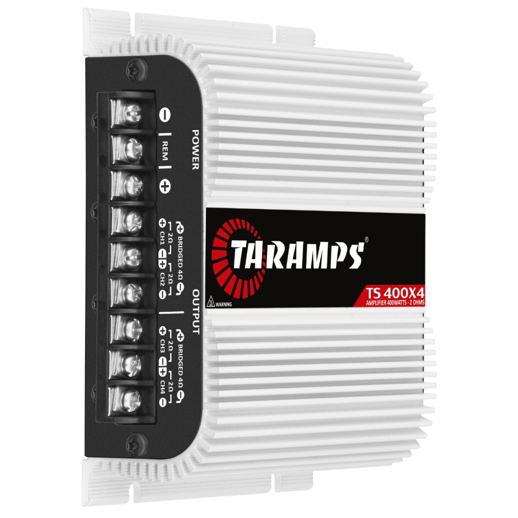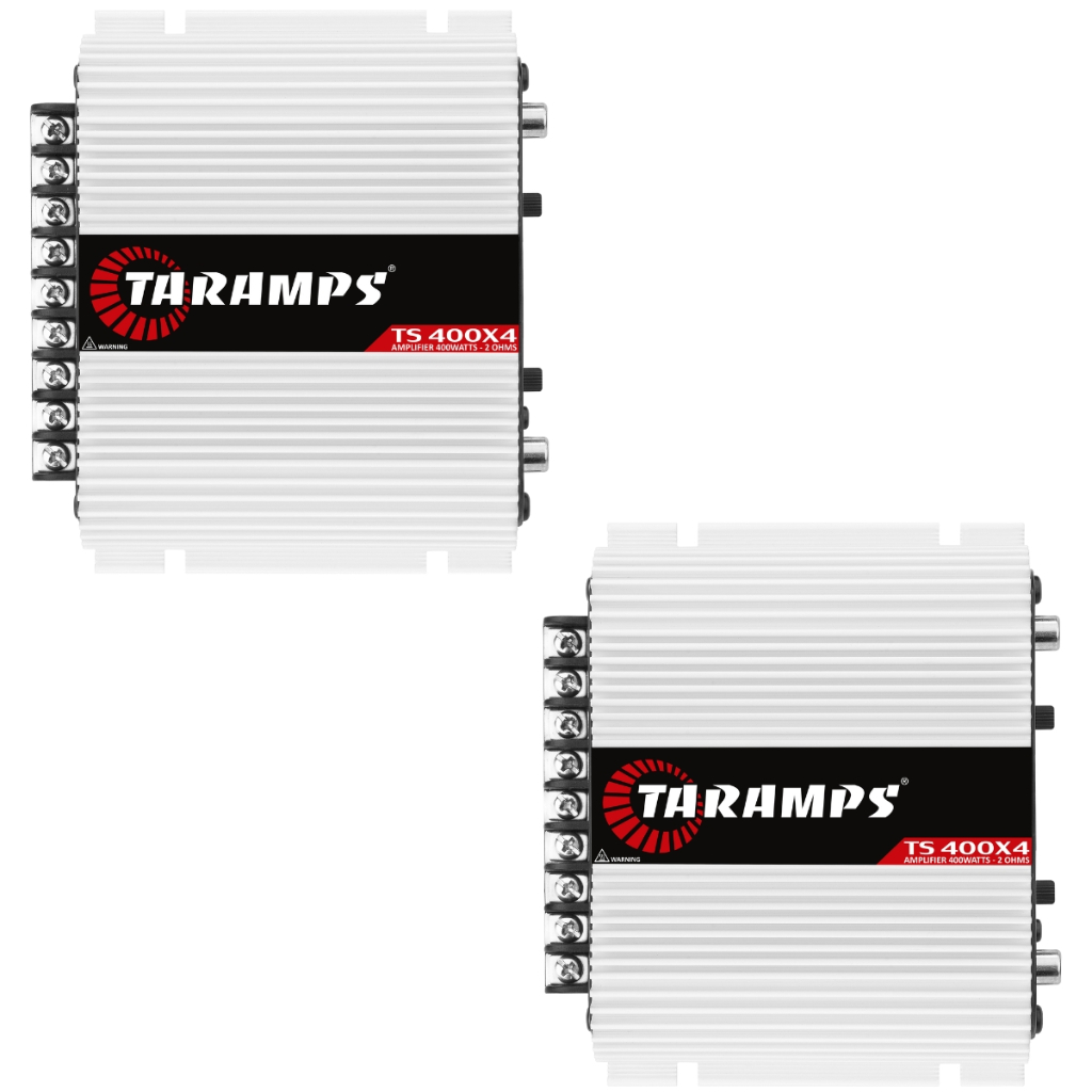KIT COM 2 PEÇAS !! O módulo amplificador TS 400×4 da Taramps foi desenvolvido com a mais alta performance pros mais variados tipos de sistemas de som automotivo. É multicanal, sendo 4 canais de 100 Watts RMS, com potência máxima de 400 Watts RMS e com impedância de 2 ohms. O TS 400×4 é FULL RANGE tocando todas as frequências na medida certa para você. Possui proteção térmica e contra curto-circuito, além do LED indicativo e crossover. Informações Técnicas • Classe de Operação: Classe D • Número de Canais: 04 • Potência Máxima: - @ 13,8 VDC - 2 OHMS - 400 W RMS (4 x 100W RMS) - @ 13,8 VDC - 4 OHMS - 252 W RMS (4 x 63W RMS) - Em Bridged @ 13,8 VDC - 4 OHMS - 400W RMS (2 x 200W RMS) • Sensibilidade de Entrada: 200mV (Vol = máx.) • Relação de Sinal/Ruído: > 90dB • Resposta de Frequência: (Full Range): 18Hz a 30kHz (-3dB) • Crossover High Pass (HPF): 90Hz(-12dB/8ª) • Crossover Low Pass (LPF): 90Hz(-12dB/8ª) • Impedância de Entrada: 22K OHMS • Impedância de Saída: 2 OHMS • Sistema de Proteção: Térmica e Curto na Saída • Tensão de Alimentação Mínima: 8 VDC • Tensão de Alimentação Máxima: 16 VDC • Consumo Em Repouso: 0,8A • Consumo Máximo Musical: @13,8VDC: 16,5 • Consumo Máximo Em Sinal Senoidal: @13,8VDC: 33A • Dimensões (LxAxP): 138 x 49 x 121mm • Peso: 0,6kg
