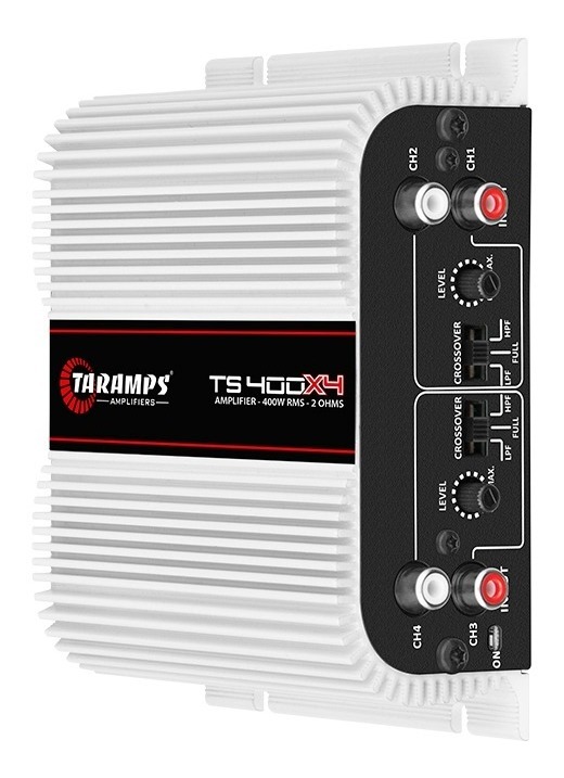 A Aleta Online tem o prazer de oferecer mais um produto de excelente qualidade, com otimos precos para voce. Nossos produtos sao enviados em 24hrs e excelentemente embalados para sua seguranca. Estamos a disposicao para qualquer duvida sobre o produto. Somos uma empresa honesta e estamos prontos para resolver qualquer problema que possa ocorrer com a sua compra. Temos 9 anos de experiencia no mercado de autopecas e som, com isso temos a capacidade oferecer um excelente servico para voce consumidor. Taramp's TS400x4 - CLASSE DE OPERACAO: Classe D NUMERO DE CANAIS: 04 - POTENCIA MAXIMA: @ 13,8 VDC - 2 OHMS - 400 W RMS (4 x 100W RMS) ,@ 13,8 VDC - 4 OHMS - 252 W RMS (4 x 63W RMS), Em Bridged @ 13,8 VDC - 4 OHMS - 400W RMS (2 x 200W RMS) - SENSIBILIDADE DE ENTRADA: 200mV (Vol = max.) - RELACAO DE SINAL/RUIDO: > 90dB - RESPOSTA DE FREQUENCIA(Full Range): 18Hz a 30kHz (-1dB) - CROSSOVER HIGH PASS (HPF): 90Hz(-12dB/8a) - CROSSOVER LOW PASS (LPF): 90Hz(-12dB/8a) - IMPEDANCIA DE ENTRADA: 22K OHMS - IMPEDANCIA DE SAIDA: 2 OHMS - SISTEMA DE PROTECAO: Termica e Curto na Saida - TENSAO DE ALIMENTACAO MINIMA: 8 VDC - TENSAO DE ALIMENTACAO MAXIMA: 16 VDC - CONSUMO EM REPOUSO: 0,8A - CONSUMO MAXIMO MUSICAL: @13,8VDC: 16,5 - CONSUMO MAXIMO EM SINAL SENOIDAL: @13,8VDC: 33A - DIMENSOES (LXAXP): 138 x 49 x 121mm - PESO: 0,6kg Produto a pronta entrega A POSTAGEM SERA FEITA DENTRO DO PRAZO 24 HORAS UTEIS. PARA CNPJ FORNECER DADOS DE UMA PESSOA FISICA PARA A NF GARANTIA 12 meses contra defeitos de fabricacao