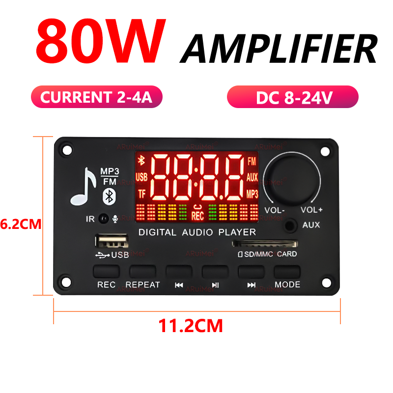 Placa Amplificadora Bluetooth 5.0 de Alta Potência 2x40W com Controle Remoto e Display 📦 O Que Você Receberá 1 x Módulo Amplificador Bluetooth de Alta Potência (Pré-montado em caixa plástica preta) 1 x Controle Remoto Infravermelho completo (Incluído) 1 x Cabo de Entrada de Energia DC (Enviado com segurança em embalagem industrial protetora) 🚀 Apresentando o Campeão de Alto Desempenho Libere um som cristalino e potente com nossa placa amplificadora Bluetooth flagship de 2x40W RMS. Projetada para entusiastas e profissionais, ela combina uma saída de potência séria com uma faixa de entrada DC incrivelmente versátil de 8V a 24V. Completa com controle remoto completo e display intuitivo, é a solução de áudio tudo-em-um definitiva para atualizar seu som automotivo, montar um sistema de home theater ou criar caixas de som DIY poderosas. ✨ Por Que Esta Placa Amplificadora é a Melhor Escolha 💥 Potência de Alta Fidelidade Autêntica Potência RMS Total de 80W: Experimente um som potente e livre de distorções que pode alimentar facilmente alto-falantes de mesa, sistemas de componentes automotivos e unidades de chão eficientes. Escalonamento Inteligente de Tensão: Entrega potência ótima com base na sua fonte—desde 8V para projetos menores até 40W por canal em 24V para máxima performance. Qualidade de Áudio Premium: Distorção ultra-baixa (<0,05%) e uma alta relação sinal-ruído garantem que sua música seja reproduzida com clareza e detalhes impressionantes. 🔗 Conectividade & Controle Total Suite de Controle Completa: Inclui um controle remoto infravermelho completo para controle conveniente de energia, volume, reprodução e seleção de entrada de qualquer lugar da sala. Display Digital Informativo: A tela de LED integrada oferece feedback em tempo real claro sobre o nível de volume, modo de operação (BT/AUX) e status. Entradas de Áudio Duplas: Alternância perfeita entre streaming Bluetooth 5.0 de seus dispositivos e uma conexão com fio via entrada AUX de 3,5mm.