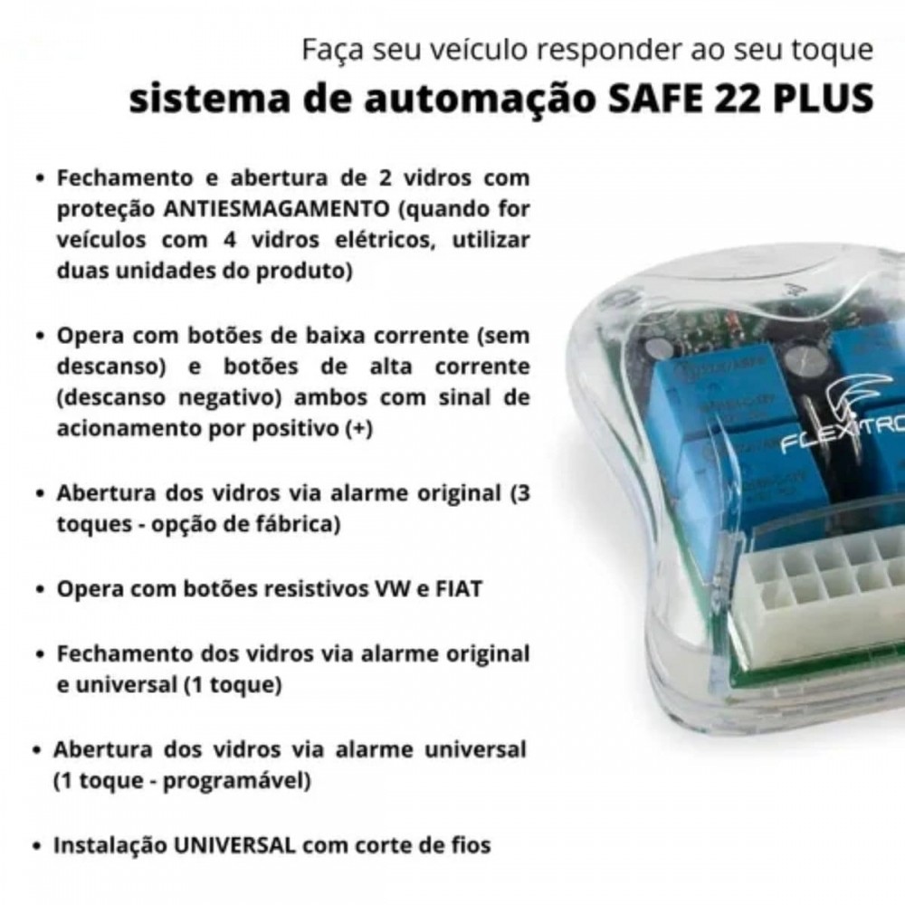 Módulo Flexitron SAFE 22 PLUS: Automação Total e Antiesmagamento para Seus Vidros Elétricos! Eleve o nível de conforto e segurança do seu carro com o Módulo Flexitron SAFE 22 PLUS. Essa central universal da Flexitron automatiza os vidros elétricos do seu veículo, incorporando a proteção antiesmagamento que atende integralmente à Resolução 468/13 do Contran. Tenha o controle total na ponta dos seus dedos, com praticidade e segurança em primeiro lugar! Conforto e Segurança em Cada Movimento: O SAFE 22 PLUS foi projetado para facilitar seu dia a dia e proteger quem você ama: Comandos One Touch Completos: Abra ou feche os vidros com um único toque em todos os botões internos do veículo, proporcionando máxima conveniência. Fechamento Pelo Alarme: Ao travar o carro, os vidros se fecham automaticamente com apenas um toque no controle remoto original ou universal do veículo. Abertura Pelo Alarme: Abra os vidros com um toque pelo alarme universal (função programável) ou com três toques pelo alarme original (opção de fábrica). Perfeito para arejar o carro antes de entrar! Proteção Antiesmagamento Essencial: Em caso de detecção de um obstáculo durante o fechamento, o movimento é interrompido imediatamente, garantindo a segurança de crianças e animais de estimação. Instalação Versátil e Especificações Técnicas: O SAFE 22 PLUS é um módulo robusto e adaptável, desenvolvido pela Flexitron, líder em acessórios automotivos: Instalação Universal: Compatível com a maioria dos veículos, sua instalação é realizada com corte de fios. Programação Fácil: O módulo possui uma programação fácil e ágil, garantindo que você aproveite suas funcionalidades rapidamente. Ampla Compatibilidade de Botões: Opera com botões resistivos das linhas VW e FIAT, e é compatível com o botão de bloqueio da linha FIAT e botões de trava e destrava da linha VW (exceto VW UP!). Flexibilidade de Fiação: Funciona tanto com botões de baixa corrente (sem descanso) quanto de alta corrente (descanso negativo), ambos com sinal de acionamento por positivo (+). Para Veículos com 4 Vidros: Se o seu carro possui 4 vidros elétricos, será necessário utilizar duas unidades do produto para automatizar o fechamento e abertura de todos eles com proteção antiesmagamento. Compatibilidade: Universal: Este módulo é compatível com praticamente todos os veículos que possuem vidros elétricos. Transforme a experiência de usar os vidros elétricos do seu carro com o Flexitron SAFE 22 PLUS. Conforto, praticidade e segurança agora estão ao seu alcance!