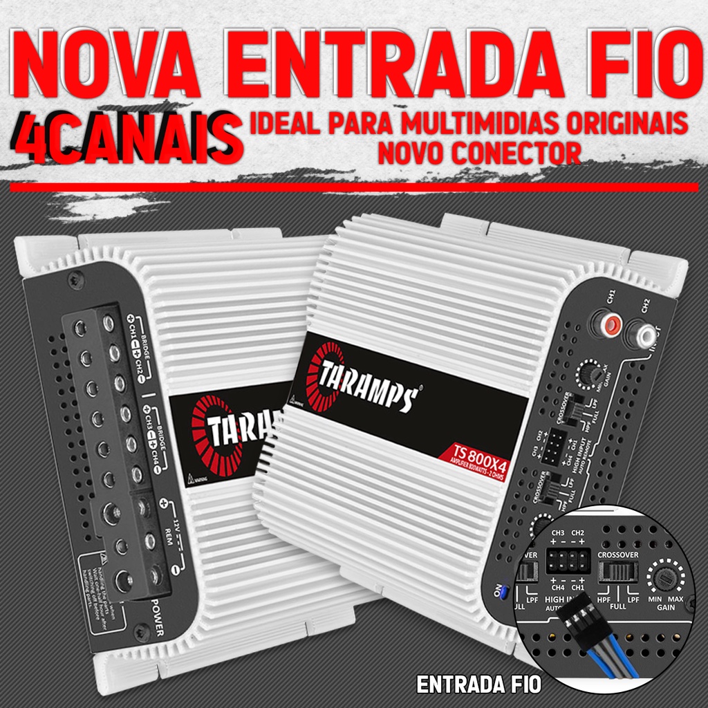 TS800 x4 800 WRMS Lançamento Novo 2 Ohms RMS Modulo Taramps Digital Amplificador Canais W Watts RMS Som Automotivo Ohm Ohms Banda Compact 4 Canais 200 Por que adquirir este produto com a Loja do Som e Acessórios? • Todos os produtos à pronta entrega • Produtos de qualidade garantida • Equipe de atendimento especializada • Envio em 24 horas após o pagamento • Compra com segurança e credibilidade • No mercado há mais de 10 anos • Produtos com garantia e nota fiscal A linha de módulos Taramps TS possui tecnologia SMD, oferecendo em seus modelos de amplificadores baixo consumo de bateria, além de serem pequenos, leves e versáteis. Este modelo conta com uma potência máxima de 800 RMS reais, 4 canais e Impedância de 2 Ohms - Cada canal possui potência de 200 Watts RMS, além de poder ser ligado em Bridge ( 2x 400WRMS ) O módulo trabalha com resposta de frequência de 20Hz até 36.000Khz (-1dB) com baixa distorção harmônica, além de possuir 2 Crossovers embutidos e 2 Regulagens de ganho (1 para cada par de canal) - Proporcionando alto rendimento e excelente qualidade. TS800X4 Compact é a atualização do Modelo TS800, ficando mais compacto e eficiente, além de possuir várias tecnologias para facilitar seu uso e aumentar a segurança do som automotivo. [CARACTERÍSTICAS] • LEDS Indicadores de proteção no amplificador ( Contra curto circuito, baixa voltagem e de funcionamento ) • Compacta e versátil • 4 Canais de 200WRMS (Bridge 2x400Wrms) • Entrada RCA ou FIO [ESPECIFICAÇÕES TÉCNICAS] • Classe de operação: D • Quantidade de canais: 4 Canais • Potência MÁXIMA @ 14,4 VDC - 2 OHMS: 800W RMS (4 x 200W RMS) @ 14,4 VDC - 4 OHMS: 544W RMS (4 x 136W RMS) 2 Canais Bridge: 4 Ohms 400W RMS (2 x 400W RMS) • Sensibilidade de entrada (Gain = Max): 250mV (RCA) / 3V (FIO) (Gain = Max): 4V (RCA) / > 10V (FIO) • Relação de Sinal / Ruído: >90dB • Reposta de frequência: 10Hz - 20KHz (-3dB) • Crossover High Pass (HPF): 90Hz (-12dB/8ª) Fixo • Crossover Low Pass(LPF):90Hz (-12dB/8ª) Fixo • Impedância de Entrada: 10K Ohms (RCA) • Sistema de Proteção:Curto na Saída • Tensão de alimentação mínima: 9VDC • Tensão de alimentação máxima: 16VDC • Consumo em Repouso: 0,9A • Consumo MÁXIMO musical : @14,4VDC: 38A • Consumo MÁXIMO em SINAL SENOIDAL: 76A • Dimensões(LXAXP): 138 x 48 x 175mm • Peso: 0,87Kg • EAN: 7898556849043 [CONTEÚDO DA EMBALAGEM] • 1 Módulo Amplificador TS800x4 Compact IMPORTANTE: A Loja do Som e Acessórios recomenda que a instalação seja feita por profissional especializado e não se responsabiliza pelo mau uso do produto. [DÚVIDAS FREQUENTES] • Como funciona a garantia? R: Nossos produtos têm uma etiqueta de garantia para nosso controle interno, com essa etiqueta verificamos se o produto é nosso mesmo, portanto NÃO tire a etiqueta do produto. • O produto está disponível a pronta entrega? R: Sim, todos os nossos produtos estão no nosso estoque preparado para ser embalado e enviado pra você! • Caso haja qualquer dúvida sobre o seu pedido/produto entre em seu pedido e nos envie uma mensagem, estaremos à sua disposição.