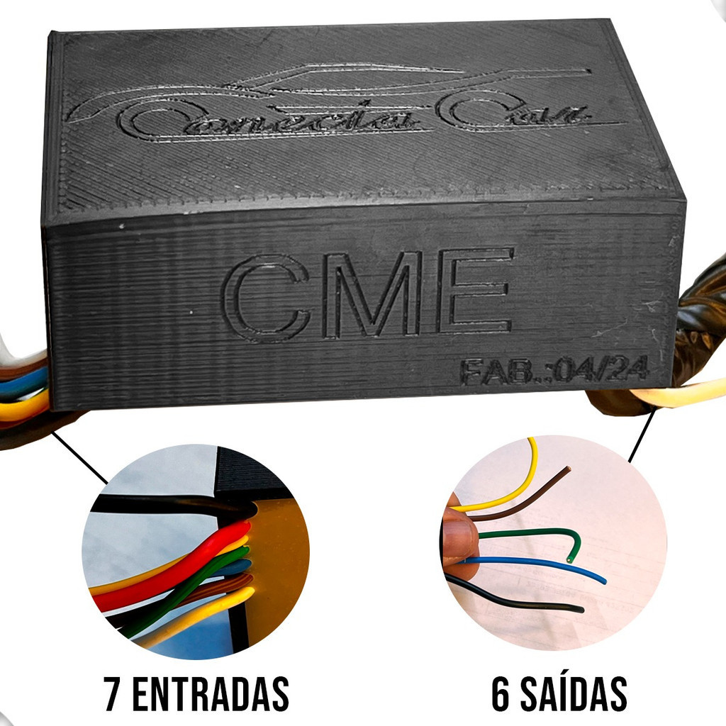 Módulo de Luzes e Seta Para Engate Eletrônico com Fiação - CME - Universal Conecta Car O Módulo Reboque Interface Conecta Car Universal é a solução perfeita para quem busca praticidade e segurança ao rebocar seu veículo. Com a marca Conecta Car você estará seguro e protegido contra qualquer avaria que possa danificar seu carro, garantindo alta qualidade e desempenho. Desenvolvido para eliminar alertas e curtos, este módulo é potente e forte, proporcionando uma experiência tranquila durante o reboque. Além disso, sua versatilidade o torna universal, podendo ser utilizado em diferentes modelos de carros. Com ele você terá total controle e segurança ao rebocar seu veículo. Não perca mais tempo e adquira já o seu! IMPORTANTE Produto é universal e atende 90% dos carros comercializados no Brasil. Alguns carros compatíveis: Tracker, Voyage, Fiat Toro, Hilux, Onix, Mobi, Nivus, Virtus, Polo, T-cross, Jeep Compass, Strada, Chevrolet, Pick-up, e outros. Módulo eletrônico para a instalação elétrica de engates em veículos. Possui chicotes maiores para facilitar a instalação sem necessidades de adquirir fios a parte além de ser a prova d'agua. Produto á prova d'agua e blindado. Possui as seguintes funções: 1) Protege contra inversões de polaridade na conexão entre a carreta e o engate. 2) Evita que a luz de anomalia seja ativada no painel do veículo quando estiver rebocando. 3) Transmite os sinais de Freio, Lanternas, Setas Direita e Esquerda. [CONTEÚDO DA EMBALAGEM] • 01 Módulo de Engate com Fiação CME • Chicote Para Instalação º Manual do usuario [DÚVIDAS FREQUENTES] • Como funciona a garantia? R: Nossas mercadorias contêm uma etiqueta de garantia para nosso controle interno, com essa etiqueta verificamos se o produto é nosso mesmo, portanto NÃO tire a etiqueta do produto. Observação: É compatível com luz de led ou Halógeno (normal).