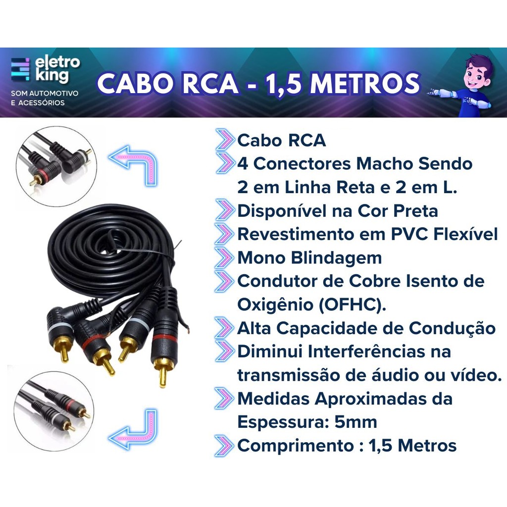 Módulo Stetsom IR400.4 400 Watts Rms + Cabo RCA 1,5 Metros Com o Módulo Stetsom IR400.4 de 400 Watts RMS e o Cabo RCA de 1,5 metros, seu som automotivo ganha potência e clareza excepcionais, garantindo graves intensos e máxima qualidade em cada batida. A escolha ideal para quem busca uma experiência sonora completa!. Especificações Técnicas: Modulo Amplificador Stetsom Ir400.4 - 400wrms 4 Rca Entrada • Potência RMS em 2 Ohms 13,8V: 4 x 100W RMS • Potência RMS em 4 Ohms 13,8V: 4 x 60 W RMS • Potência @ 13.8V Bridge 4 Ohms: 2 x 200W RMS • Impedância de Entrada: 20K Ohms • Impedância Mínima de Saída: 2 Ohms Stereo / 4 Ohms Bridge • Resposta em Frequência: 10Hz ~ 30 KHz • Número de Canais: 4 • Tensão de Alimentação: 9 ~ 15V • Crossover Low Pass: 90 Hz • Crossover High Pass: 90 Hz • Relação Sinal Ruído: > 90 dB • Distorção Harmônica: > 0,03 % THD • Sensibilidade de Entrada: 200 mV • Consumo com Sinal Musical: 16 A • Consumo com Sinal Bass: 32 A • Dimensões: 5,2 x 127,5 x 116mm ( A x L x C ) • Peso Kg: 0,630 Kg Cabo Rca 1,5 Metros Preto Conector Banhado A Ouro • Cabo RCA • 4 Conectores Macho Sendo 2 em Linha Reta e 2 em L • Disponível na Cor Preta • Revestimento em PVC Flexível • Mono Blindagem • Condutor de Cobre Isento de Oxigênio (OFHC) • Alta Capacidade de Condução • Diminui Interferências na Transmissão de Áudio ou Vídeo • Medidas Aproximadas da Espessura: 5mm • Comprimento Aproximado: 1,5 Metros Conteúdo da Embalagem: • 01 Módulo Stetsom IR400.4 400 Watts Rms • 01 Cabo Rca - 1,5 metros • Manual e Certificado de Garantia Importante: • Garantia de 273 Dias. • Valor do Kit.