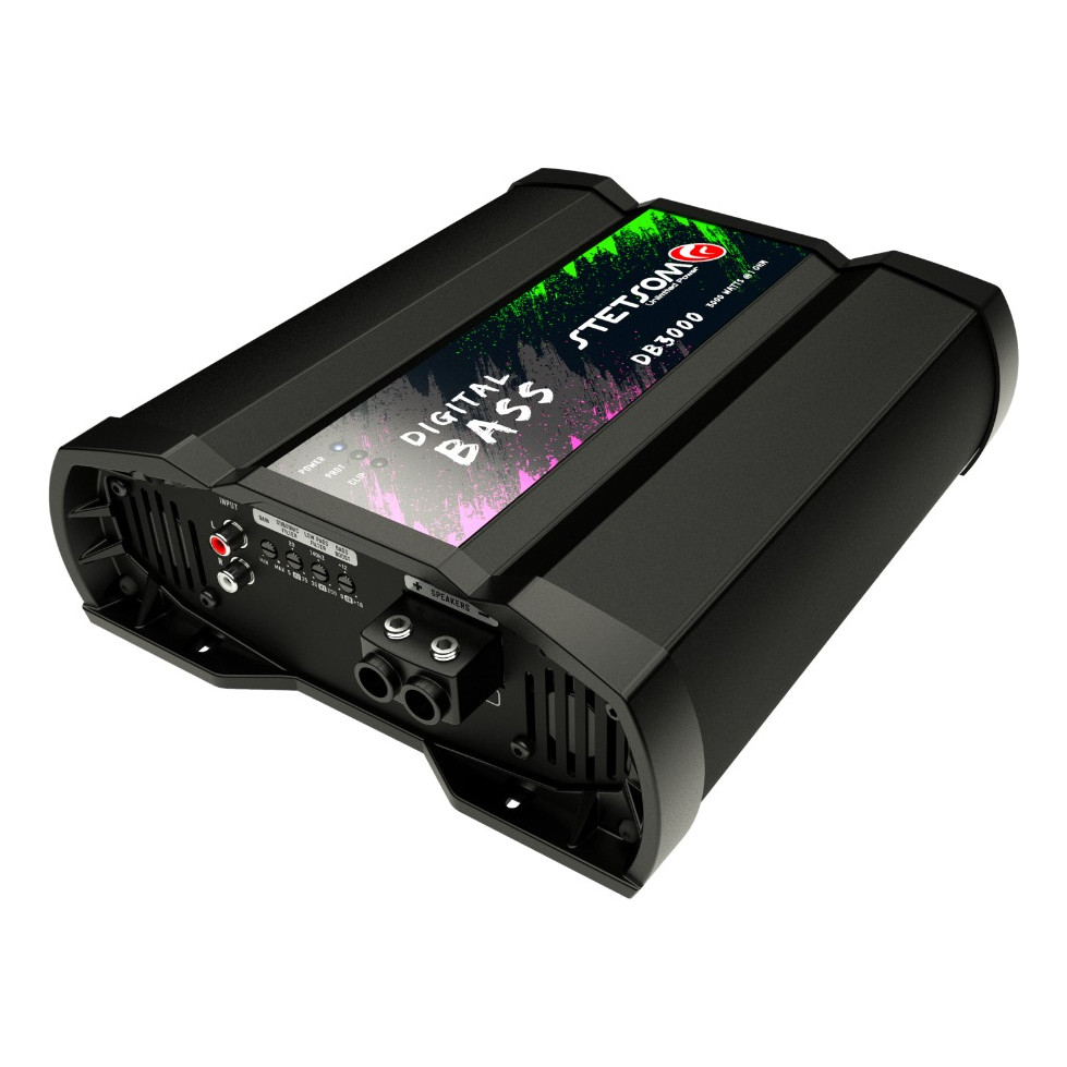 ----- DB3000 1 OHM STETSOM ----- •A linha DIGITAL BASS foi desenvolvida para amantes do som automotivo que buscam máximo desempenho em baixas frequências. •Sua resposta de frequência de 5Hz a 250Hz oferece qualidade e definição de frequências mais baixas, entregando graves poderosos e intensos. •1 canal e 1 Ohm para que a versatilidade seja ainda maior na hora de compor o projeto de som automotivo, chegando até 3950w Rms em 14,4v. Número de Canais1 Potência RMS em 1 Ohm 12,6V 3100W Potência RMS em 2 Ohms 12,6V 2000W Potência RMS em 1 Ohm 14,4V 3950W Potência RMS em 2 Ohms 14,4V 2600W Tensão de Alimentação 9V 16V Resposta em Frequência 5Hz 250Hz Crossover Low Pass 35Hz 250Hz Crossover High Pass 5Hz 35Hz (Subsonic) Relação Sinal Ruído> 90dB Sensibilidade de Entrada 200mV Impedância de Entrada 20K Ohms Consumo com Sinal Musical 169A Consumo com Sinal Bass 338A Dimensões (A x L x C) mm 78 x 231,5 x 276 Peso Kg 3.1 Kg