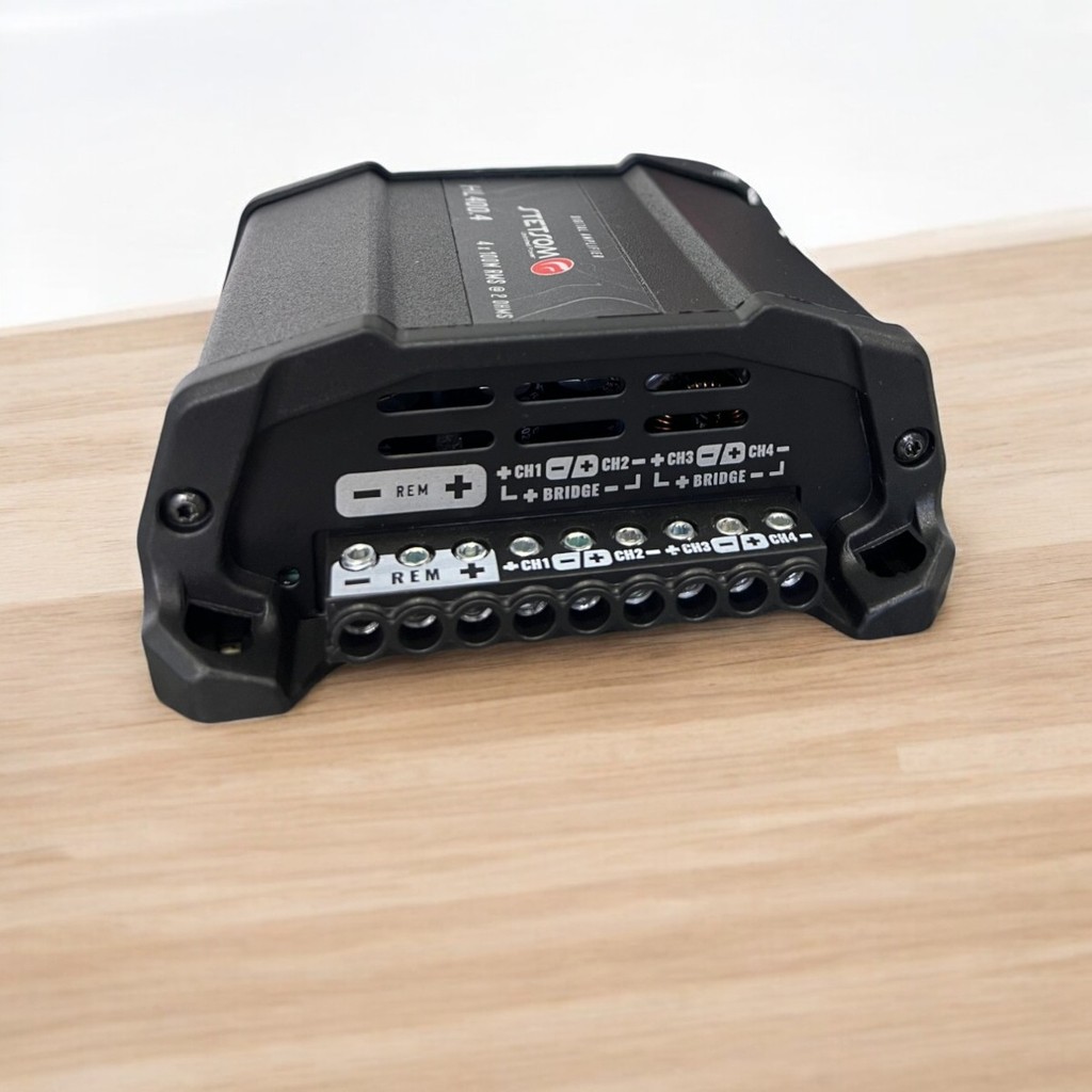 O HL400.4 foi projetado para proporcionar um desempenho excepcional com qualidade de áudio superior mesmo com seu tamanho compacto. Com 4 canais de saídas amplificadas e resposta em frequência de 5Hz a 24Khz, oferece flexibilidade para utilização em ESTÉREO ou BRIDGE. Ideal para sistemas de áudio completos como por exemplo com alto-falantes coaxial, triaxial, subwoofer, woofer, drivers ou tweeters, oferece versatilidade para utilizar um único amplificador. Processamento de áudio HD: Desfrute de uma reprodução de áudio precisa e de alta fidelidade, com médios bem definidos e agudos nítidos. Controles CROSSOVER: O amplificador conta com chaves CROSSOVER, permitindo ajustes precisos de frequência para atender às necessidades específicas do sistema. CANAIS CH1 & CH2 (MODOS): - FLAT: Sem nenhum corte de frequências. - L.P.F: Frequência de 90Hz (fixo). - H.P.F: Frequência de 90Hz (fixo). CANAIS CH3 & CH4 (MODOS): - FLAT: Sem nenhum corte de frequências. - L.P.F: Frequência de 30Hz a 75Hz (variável) + Bass Boost de 14dB (Saída com ajuste de baixas frequências, ideal para uso com SUBWOOFER). - H.P.F: Frequência de 90Hz (fixo). Modo BRIDGE para GRAVES FORTES: Ao unir dois canais, o amplificador opera em modo BRIDGE, dobrando a potência disponível para alimentar SUBWOOFERS ou outros componentes exigentes. Conectores robustos e isolados: Os conectores foram projetados para oferecer uma conexão segura e confiável, com acabamento isolante em ABS para proteção da instalação. + TECNOLOGIA + COMPACTO + STETSOM Especificações Técnicas - Número de Canais: 4 - Potência RMS: 400W - Potência RMS em 2 Ohms 13,8V: 4 x 100W - Potência RMS em 4 Ohms 13,8V: 4 x 60W - Potência RMS em 2 Ohms 14,4V: 4 x 405W - Potência RMS em 4 Ohms 14,4V: 4 x 70W - Potência @ 13.8V Bridge 4 Ohms: 2 x 200W - Tensão de Alimentação: 9V ~15V DC - Resposta em Frequência: 5Hz ~ 24KHz - Relação Sinal Ruído: >90dB - Sensibilidade de Entrada: RCA: 200mV / FIO: 1.5V - Impedância de Entrada: RCA: 5K Ohms / FIO: 1K Ohms - Impedância Mínima de Saída: STEREO: 2 Ohms / BRIDGE: 4 Ohms - Consumo com Sinal Musical: 17A - Consumo com Sinal Bass: 34A - Dimensões (A x L x C) mm: 50 x 125 x 124 mm - Peso Kg: 520g