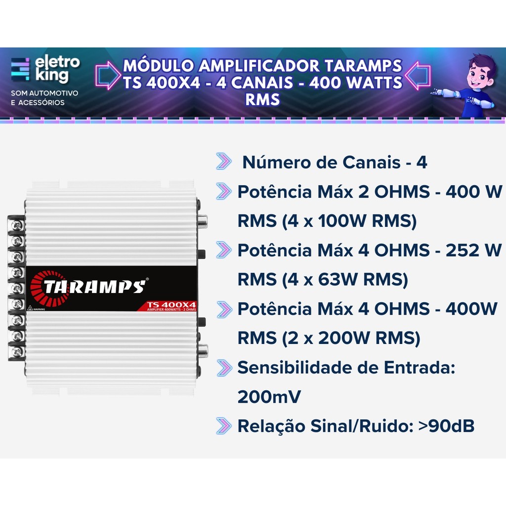 | Módulo Taramps TS400x4 + 3 Cabos RCA Blindado Série 400 1 Metro este produto | R$ 389,28 | — | 5.0/5 | — |