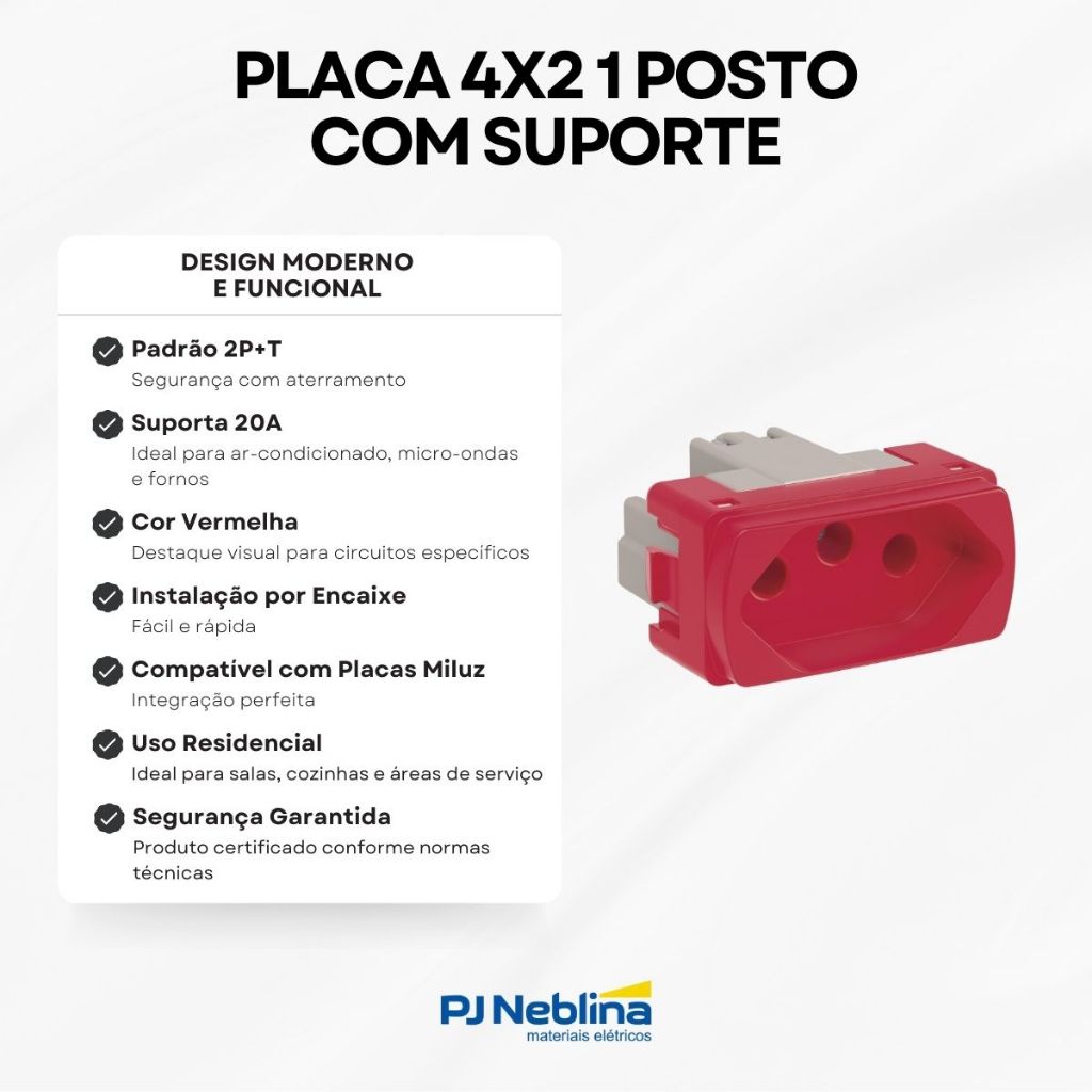 Módulo Tomada 2P+T 20a Vermelha S3B70359 - Schneider CARACTERÍSTICAS: • Módulo de tomada 2P+T com acabamento na cor vermelha para identificação rápida e segura. • Ideal para aplicações que exigem diferenciação visual, como circuitos específicos ou equipamentos críticos. • Compatível com as placas da linha Miluz, facilitando a montagem e personalização. • Estrutura robusta, projetada para suportar uso intenso com segurança. • Design compacto que otimiza o espaço e proporciona um acabamento discreto. • Encaixe firme, garantindo estabilidade e confiabilidade na conexão elétrica. • Produto Schneider, sinônimo de qualidade e durabilidade no setor elétrico. APLICAÇÃO: • Ideal para instalações industriais, laboratoriais ou comerciais que demandam identificação de circuitos. • Indicada para ambientes onde é necessário diferenciar pontos de energia para maior segurança. • Pode ser integrada a composições modulares com outros dispositivos da linha Miluz. ESPECIFICAÇÕES TÉCNICAS: Marca: Schneider Linha: Miluz Produto: Módulo Tipo: Tomada Corrente nominal: 20 A Tensão de operação nominal: 250 V CA Material: ASA + PC: dispositivo de fiação Número de módulos: 1 módulo Cor: Vermelha Acabamento: Brilhante Referencia: S3B70359 Modo de fixação: Encaixe Conexões - terminais: Terminais de braçadeiras roscadas Seção do cabo: 4 mm Medidor AWG: AWG 12 Dimensões: Altura: 2 cm Largura: 4,14 cm Profundidade: 4 cm Após o período de garantia da loja de 30 dias, a tratativa de garantia deverá ser diretamente com o fabricante. Garantia do Fabricante: 18 Meses.