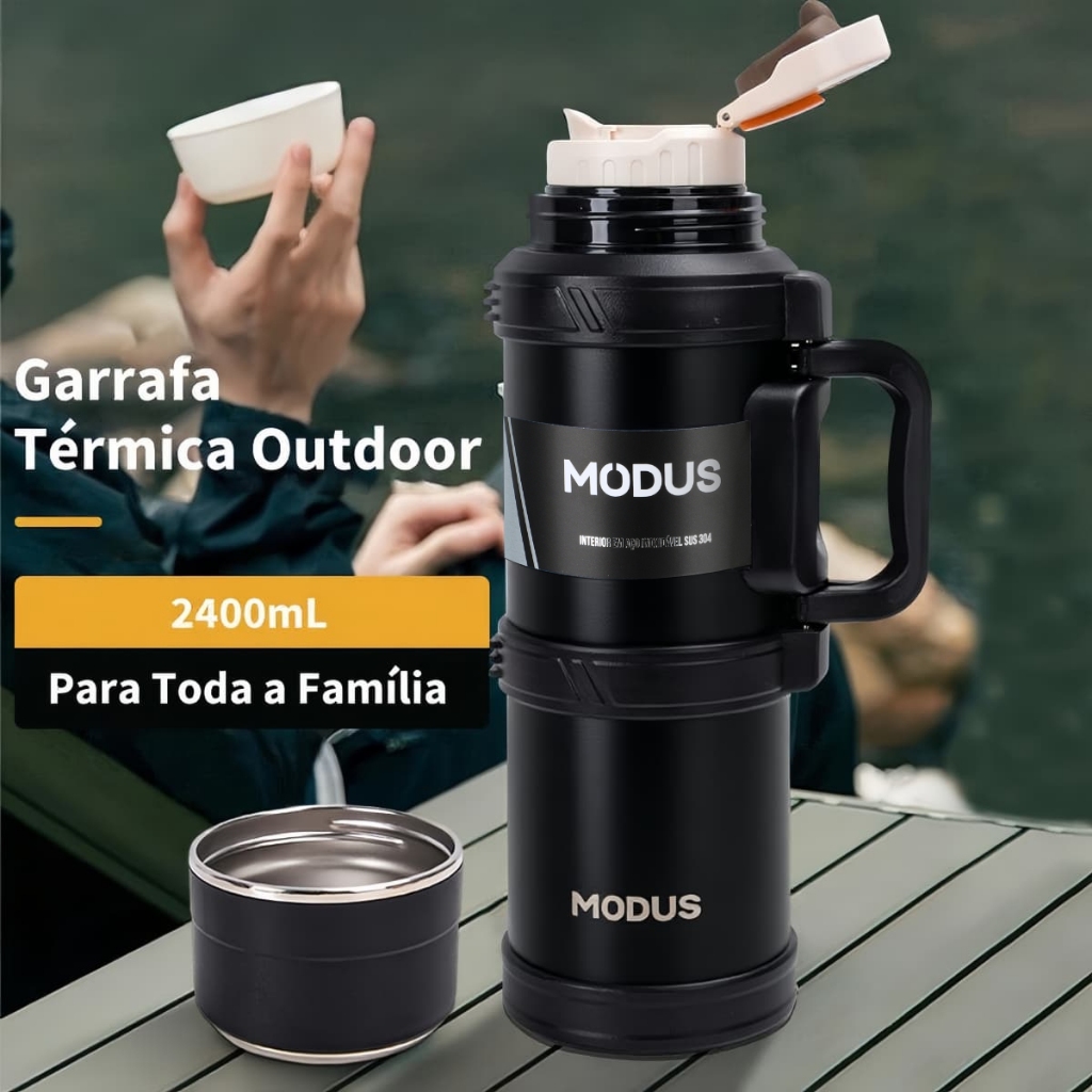 Marca:MODUS Material: 304 no interior e no exterior Capacidade: 2400ml Color: verde exército, preto Mantém-se quente durante 12-36 horas Processo de pulverização de plástico na superfície da garrafa Com pega retrátil na parte lateral, design portátil, perfeito para utilização no exterior. design à prova de vazamentos, pode ser carregado na bolsa. Materiais saudáveis, livre de BPA. Processo de revestimento de cobre: consiste em aplicar uma fina camada de cobre na parte interna ou em determinados componentes do copo térmico, por meio de uma técnica específica. O principal objetivo é melhorar a capacidade de conservação da temperatura.