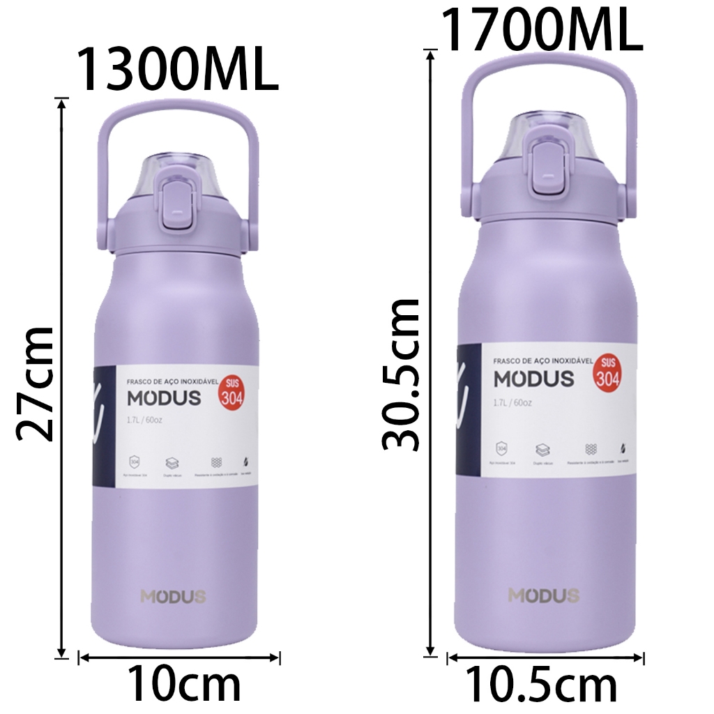 Marca: MODUS Design exclusivo: Com o botão One Touch Open and Close e a tampa higiênica flip top. A tampa e o canudo podem ser desmontados de forma independente e são fáceis de limpar. Material de alta qualidade: Feito de aço inoxidável e Sem BPA , a garrafa de água isolada a vácuo de metal significa melhor retenção de calor e frio e impede a condensação do lado de fora. À prova de vazamentos e fácil de beber: A tampa com trava à prova de vazamentos evita 100% de vazamentos. Além disso, a garrafa de água tem um canudo longo que chega até o fundo, para que você possa beber facilmente. Grande capacidade de 1700ML : a garrafa de água tem a capacidade de atender às suas necessidades diárias. Seja em uma caminhada ou em um acampamento, você pode aproveitá-la com confiança. Presente perfeito: esta garrafa de água é o melhor presente para sua família, mãe, pai, marido, esposa, amantes, vizinhos, amigos, colega de trabalho.