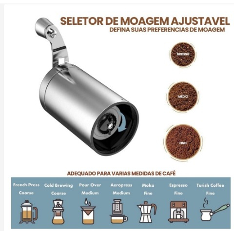 Moedor De Café Manual Gourmet Profissional Em Aço Inox Com Manivela Torne-se um barista em sua própria casa e tenha uma experiência inigualável Descrição Moedor de Café em aço inox: 1. Material: aço inoxidável e vidro. Bom para sua saúde. Utilizações infinitas. 2. Ecológico, menos resíduos e economizar mais dinheiro. 3. Produto inovador, tenha café fresquinha sempre que precisar. 4. Núcleo de moagem em cerâmica com regulagem, durabilidade extraordinária. 5. Versátil, permite moer qualquer tipo de grão. Especificações Moedor de Café em aço inox: Cor: Transparente Altura: 17,50cm Largura: 6,50cm Largura com alça: 6,50cm Peso: 0.280kg Conteúdo do kit: 1 und. Moedor de café em aço inox