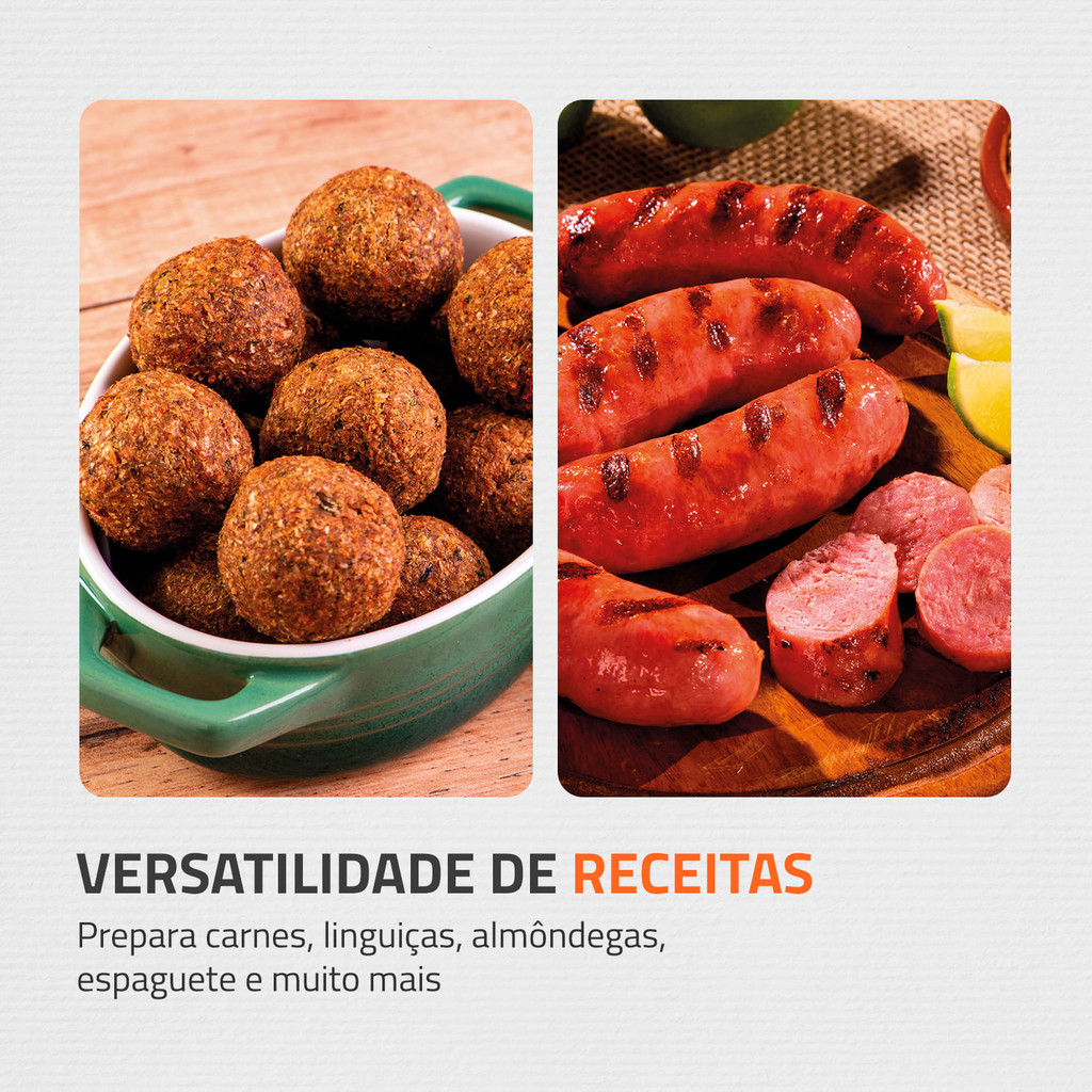 Com o Moedor de Carne Premium Mondial vai ser fácil fazer aquela carne moída no jantar! O moedor prepara carnes, linguiças, almôndegas, espaguete e muitos outros alimentos, de forma prática e segura. Conta com potência de 500W, bandeja e lâminas em aço inox, além de 6 acessórios que facilitam os preparos. Saiba mais sobre o MC-03 da Mondial: POTÊNCIA DE 500W: Motor superpotente com duplo rolamento. Ótimo desempenho e mais agilidade no dia a dia. MULTIFUNÇÃO: Além de moer, o produto processa e modela diversos tipos de alimentos. VERSATILIDADE DE RECEITAS: O moedor de carne Mondial prepara carnes, linguiças, almôndegas, espaguete e muito mais. BANDEJA E LÂMINAS EM AÇO INOX: Muito mais duráveis e eficientes para o preparo de diversas receitas. FUNÇÃO REVERSE: Altera o sentido da moagem e libera as sobras de carne. MAIS PRATICIDADE: O botão Liga/Desliga inicia o processo de moagem de forma simples. KIT ACESSÓRIOS: Acompanha 1 pilão, 3 discos moedores, 1 modelador de bolinhos, 1 cone para modelar linguiça e 1 bandeja em inox para carne. UM ANO DE GARANTIA MONDIAL: A Mondial é a escolha de milhões de consumidores. Mondial, a escolha inteligente!