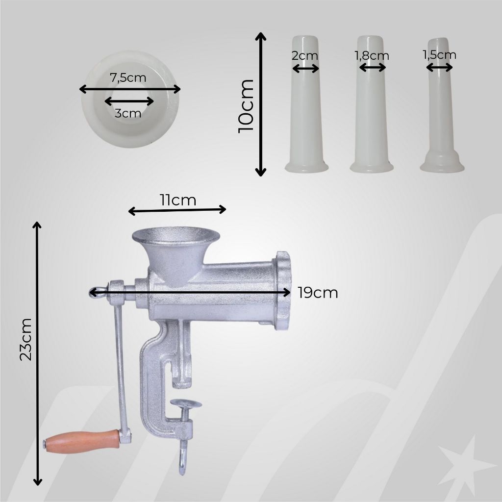 Moedor de Carne Manual Nº10 em Ferro Fundido – Qualidade, Resistência e Praticidade Dasshaus Tenha carnes frescas e moídas na hora com o Moedor de Carne Manual Nº10 Dasshaus, produzido em ferro fundido de alta durabilidade. Ideal para uso doméstico ou profissional, oferece desempenho eficiente, fácil montagem e desmontagem, além de uma estrutura robusta e estável. Com ele, você garante carnes frescas, saborosas e seguras, mantendo o controle total sobre a qualidade do alimento que vai à mesa da sua família. Principais Benefícios: Qualidade e durabilidade: estrutura em ferro fundido resistente, projetada para uso contínuo e de longa vida útil. Desmontagem facilitada: componentes ajustados e removíveis, facilitando a limpeza e o manuseio. Carnes frescas e saborosas: mói carnes na hora, mantendo sabor, textura e qualidade. Eficiência e segurança: oferece rendimento elevado e manuseio prático com total estabilidade. Versatilidade: ideal para moer diferentes tipos de carne e preparar pratos como kafta, hambúrguer, almôndega e molhos caseiros. Especificações Técnicas: Material: Ferro fundido Cor: Cinza metálico Medidas aproximadas: Altura: 26 cm Largura: 10 cm Comprimento total (com manivela): 19 cm Itens inclusos: 1 Moedor de Carne Nº10 1 Disco de aço de 5 mm 1 Moenda interna 1 Manivela 1 Navalha Modo de Uso: Monte o moedor conforme as instruções da embalagem. Fixe em uma superfície firme, como mesa ou bancada. Insira a carne cortada em pedaços no funil superior. Gire a manivela com movimento constante até atingir a textura desejada. Desmonte as peças para limpar após o uso. Diferenciais Dasshaus: Produção robusta em ferro fundido com acabamento resistente. Design ergonômico e de fácil manuseio. Peças desmontáveis que facilitam a limpeza. Ideal para uso doméstico e profissional. Envio rápido, nota fiscal e suporte pós-venda. Cuidados de Uso: Após o uso, lave e seque completamente antes de guardar. Evite deixar o produto úmido para prevenir oxidação natural do ferro. Lubrifique levemente as lâminas com óleo vegetal se for guardar por longos períodos.