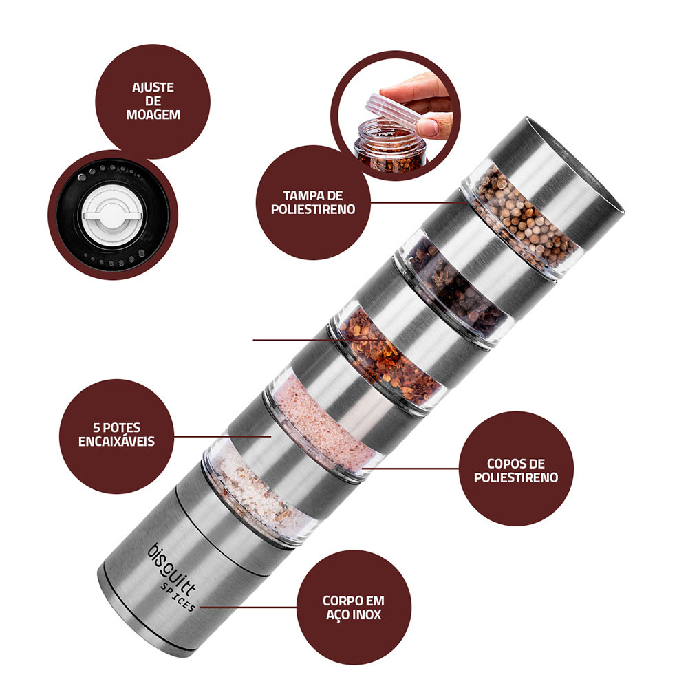 🧡 Motivos que fazem valer a Pena Praticidade com Estilo: Design funcional com 5 compartimentos destacáveis e tampas individuais Moagem com Precisão: Lâminas de cerâmica garantem uma moagem uniforme e ajustável Ajuste de Grossura: Controle o nível de moagem conforme o tipo de tempero Corpo em Aço Inoxidável: Durável, higiênico e com acabamento elegante Versátil e Funcional: Ideal para armazenar, moer e organizar os temperos mais usados 🔸Sobre o Produto O Moedor de Sal e Temperos Biscuitt Spices é a escolha perfeita para quem ama cozinhar com praticidade e quer manter os temperos preferidos sempre à mão. Seu grande diferencial está nos 5 compartimentos destacáveis com tampas individuais, que permitem armazenar os temperos separadamente ou acoplá-los ao moedor conforme a sua necessidade. Com um design moderno e versátil, o Spices Biscuitt combina a durabilidade do aço inox com a eficiência da lâmina de cerâmica, garantindo uma moagem precisa e ajustável – do tempero mais fino ao mais grosso. Ideal para quem valoriza funcionalidade, higiene e organização na cozinha, ele permite que você use apenas o compartimento necessário no momento ou encaixe todos de uma vez, alternando facilmente a ordem dos temperos. Controle total, praticidade no dia a dia e elegância em um só produto. Leve mais sabor e eficiência para sua rotina culinária com o Moedor Spices Biscuitt. 🔸Ficha técnica Altura: 25,7 cm Diâmetro: 6 cm Largura: 6 cm Peso: 300g 🔸Informações Adicionais Marca: Biscuitt Modelo: Spices Garantia do Fabricante: 12 Meses EAN: 7898693851886 Código do Fabricante: B00240 SAC do Fabricante: 08005802709 🔸Conteúdo da Embalagem 01 Moedor Manual de Temperos 01 Manual de Instruções