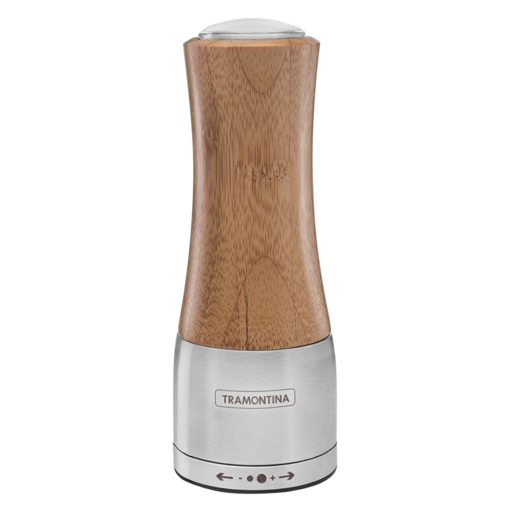Nada melhor que temperos fresquinhos e moídos na hora pra dar aquele toque especial em nossos pratos. Imagina então poder utilizar em sua casa a Linha Realce, que oferece o Moedor Tramontina Sal ou Pimenta em Bambú e Aço Inox com Moinho em Cerâmica! Com capacidade para 95 g de sal e 40 g de pimenta, tem ajuste de moagem com regulador de tamanho dos grãos para que você consiga dar às suas receitas aquele toque especial como um verdadeiro chef. Produzido em bambu e aço inox, conta com engrenagens de alta resistência que proporcionam maior durabilidade e um design despojado, prático e elegante que deixará sua cozinha sempre pronta para momentos de muita alegria e confraternização. Prático e elegante! Possui engrenagens de alta resistência, proporcionando maior durabilidade. Com ajuste de moagem, possui regulador de tamanho de grão, para que seja ajustado conforme seu gosto. Garantindo higiene e beleza. Material: Bambu + aço inox Moedores de cerâmica. Compartimento de bambu. Tampa de acrílico. Capacidade: Sal = 95 G Pimenta = 40 G Para regular o tamanho do grão: Com uma das mãos segure a base e com a outra gire o suporte de regulagem, verificando a ilustração da marcação no suporte de regulagem para o tamanho do grão que desejar (sentido horário, moagem mais grossa; sentido anti-horário, moagem mais fina). Para abastecer: Remova a tampa do compartimento e adicione o sal grosso ou a pimenta. Após, recoloque a tampa. Para moer: Posicione o moedor de cabeça para baixo. Com uma das mãos segure a base e com a outra gire o compartimento no sentido horário, para moer o tempero. USO SEGURO E ADEQUADO: Tenha cuidado ao manusear o produto, poderá quebrar ao sofrer quedas ou impactos. Ao usar o moedor com sal em ambientes muito úmidos, ele poderá não funcionar adequadamente; recomendamos trocar ou secar o sal. Não lavar o moedor; para limpeza, use um pano úmido na parte externa. Para descarte dos produtos e embalagens, siga as orientações de reciclagem vigentes. Peso: 0,20 kg Garantia: 90 dias