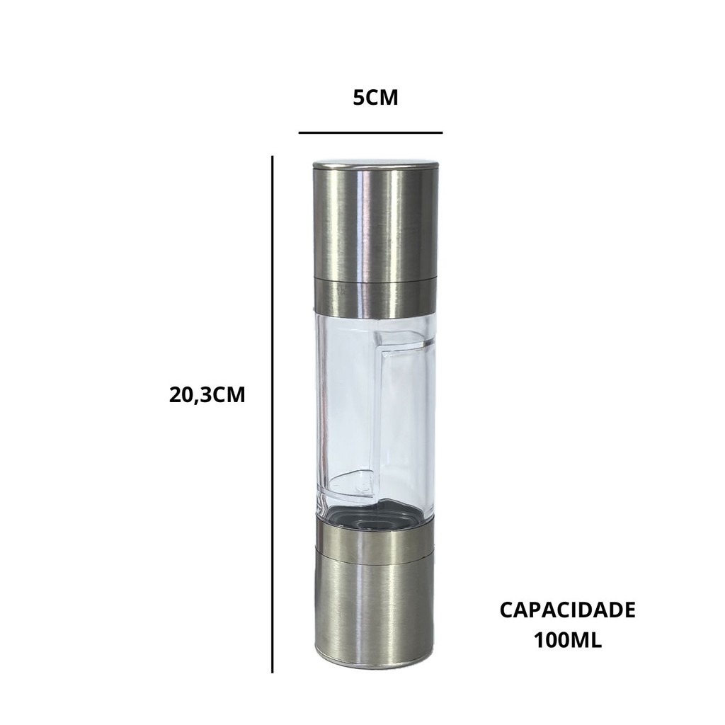 ⚠️ Aviso importante: Nosso moedor é manual (sem pilhas ou bateria). Caso veja vídeos mostrando versões elétricas, eles não correspondem a este modelo. Moedor de Temperos e Especiarias 2 em 1 – Sal e Pimenta | Manual, Ajustável e Durável Especificações: - Material: aço inox, acrílico e cerâmica; - Capacidade: 100ml; - Tamanho: 20,3 x 5 cm; - Fácil de abastecer e usar. O Moedor 2 em 1 é perfeito para quem busca praticidade, sabor fresco e um toque de sofisticação na cozinha! Com design elegante e ergonômico, ele conta com dois compartimentos independentes para moer diferentes temperos como sal grosso, pimenta, cominho e muito mais. Feito com materiais resistentes (aço inox, vidro e plástico de alta qualidade), possui moagem ajustável – do fino ao grosso – basta girar a parte superior! Fácil de abastecer, desmontar e limpar, ele traz mais praticidade para o seu dia a dia. 2 em 1: moa dois temperos ao mesmo tempo Ajuste de espessura com giro suave Alta durabilidade e fácil de limpar Ideal para sal, pimenta, ervas e especiarias
