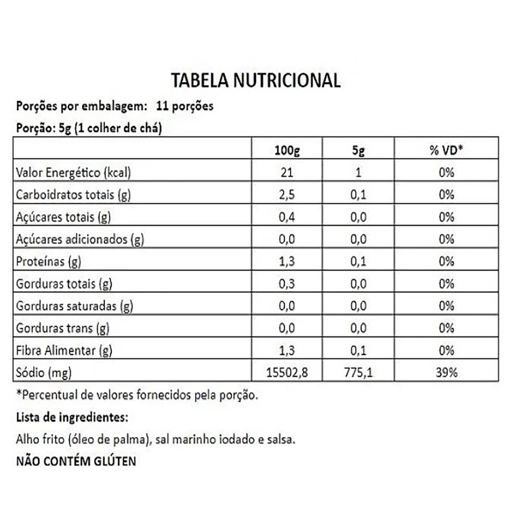 Patrimônio da gastronomia nacional, o clássico dos botecos alcança o dia a dia em um tempero cheio de potência e praticidade. Um sabor único para enriquecer o frango frito ou transformar em delícia o belisquete que você quiser. Ingredientes: Alho Frito (Alho Granulado, óleo de palma), Sal Marinho iodado, Salsa Combina com : frango