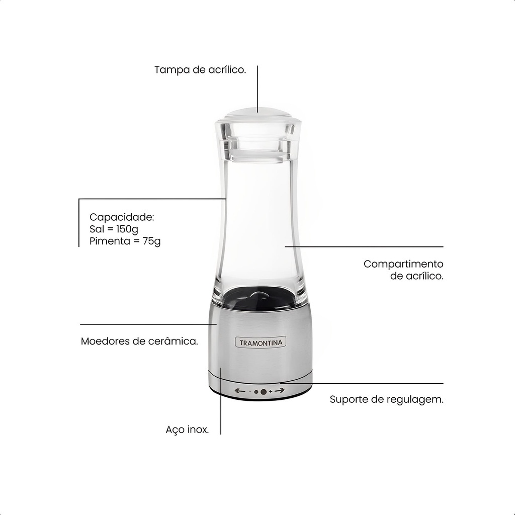 Moedor para Sal Grosso ou Pimenta Acrílico e Aço Inox Moinho Cerâmica Design Elegante Cozinha Tramontina - 61653000