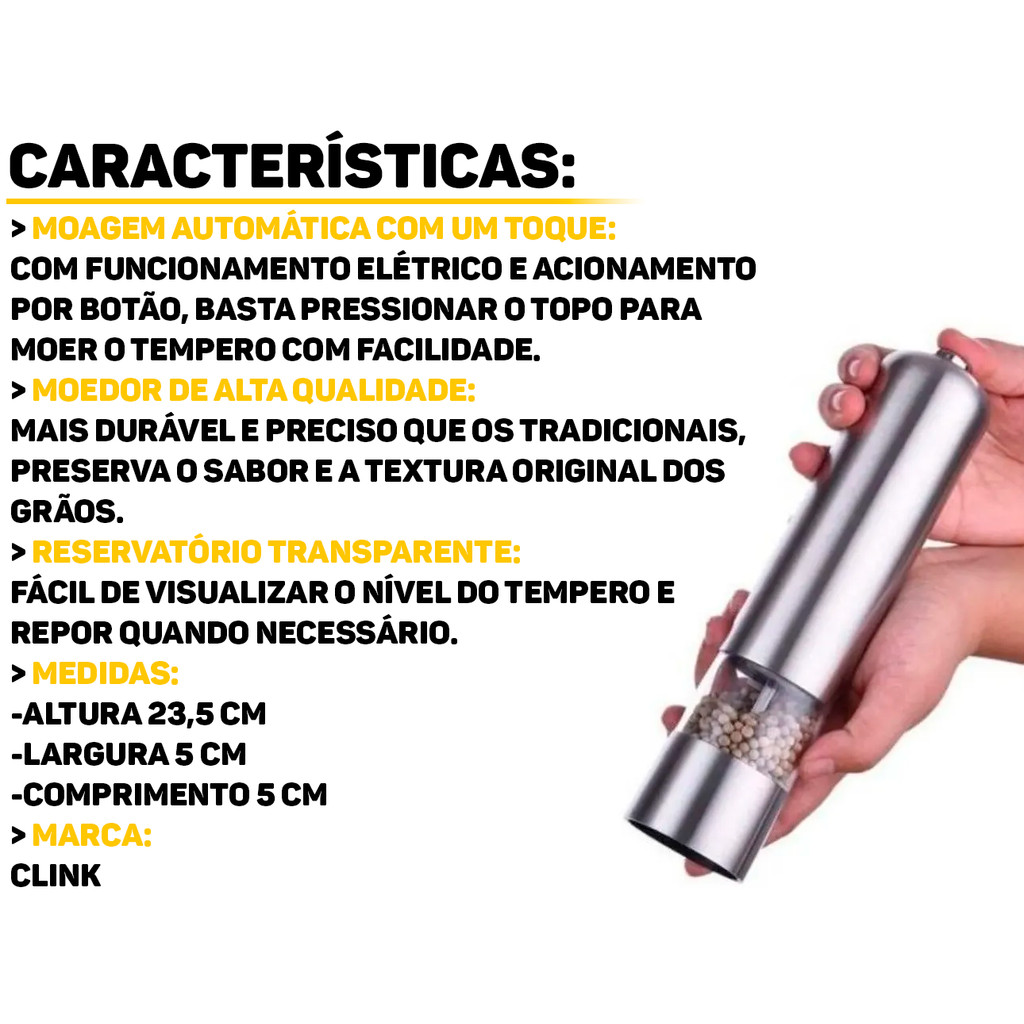 Moedor de Sal e Pimenta Clink O Moedor da Clink é uma ótima escolha para quem aprecia temperos frescos e com sabor intensificado. Com um design elegante e acabamento em aço inoxidável, combina com qualquer estilo de cozinha. Compacto e fácil de usar, é ideal para quem busca praticidade na hora de temperar e preparar suas receitas. Características: > Garante uma moagem perfeita; > Evita o desperdício e mantém os temperos frescos por mais tempo; > Acabamento elegante que combina com qualquer ambiente da sua cozinha; > O design manual proporciona uma experiência confortável e simples ao moer. Especificações Técnicas: > Material: aço inoxidável e acrílico; > Dimensões do produto (C x L x A): 23,5cm x 5cm x 5cm. - Marca: Clink - Garantia: 90 dias contra defeitos de fabricação Vantagens de comprar na Brester: - Produto a pronta entrega. - Produto novo, com garantia de fábrica. - Nota fiscal para Pessoa Física e Pessoa Jurídica.