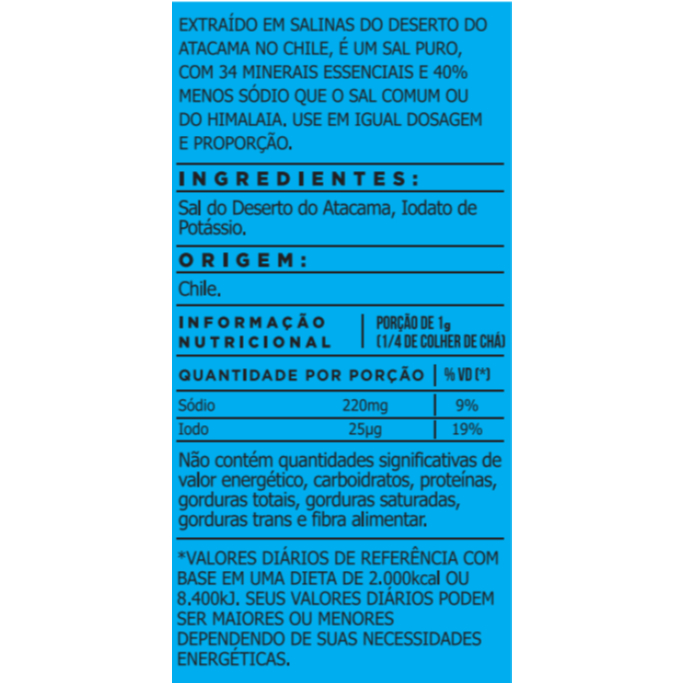 Descubra a pureza e a excelência da culinária com o Moedor de Sal do Atacama da BR Spices, 100% natural, possuindo 40% menos sódio que o sal comum. Extraído das salinas do deserto do Atacama, no Chile, este sal é enriquecido com mais de 30 minerais essenciais, proporcionando uma experiência gastronômica única e saudável, mantendo o sabor e salgando por igual. INGREDIENTES Sal do Atacama, iodato de potássio INFORMAÇÕES SOBRE O PRODUTO Sem Glúten Original Sem misturas Sem corantes Origem: Chile Frasco de Vidro com Tampa Moedora COMBINA COM Frango, vegetais, peixe, uso geral QUER DESCOBRIR DICAS DE OURO DO NOSSO CHEF FUNDADOR? Você sabia que o calor e a umidade são inimigos de temperos 100% naturais e puros? Por isso, aqui na BR Spices recomendamos que armazene as embalagens em local fresco e livre de umidade. CONHEÇA A BR SPICES Somos uma empresa jovem que nasce de uma cozinha moderna e acessível. Carregamos em nosso DNA a criatividade, alegria e o espírito empreendedor brasileiro. Boa cozinha para nós é a cozinha criativa, seja um prato prático e saudável para o dia a dia ou uma receita de domingo que faz viajar no tempo e na memória.
