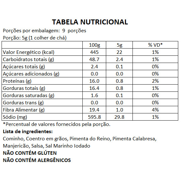 Repleto de aconchego e inspiração na tradição brasileira, o Moedor Tempero Baiano da BR Spices é a adição perfeita para transformar suas receitas em verdadeiras obras-primas culinárias. Com seu moedor integrado, cada pitada libera uma explosão de sabores autênticos diretamente da Bahia, proporcionando uma experiência sensorial única, através de ingredientes 100% naturais! INGREDIENTES Cominho, Coentro, Pimenta do Reino, Pimenta Calabresa, Manjericão, Salsa, Sal Marinho Iodado INFORMAÇÕES SOBRE O PRODUTO Sem Glúten 0% glutamato Sem conservantes Sem corantes Ingredientes 100% naturais QUER DESCOBRIR DICAS DE OURO DO NOSSO CHEF FUNDADOR? Você sabia que o calor e a umidade são inimigos de temperos 100% naturais e puros? Por isso, aqui na BR Spices recomendamos alguns cuidados com os moedores para potencializar ainda mais a sua durabilidade! Armazene as embalagens em local fresco e livre de umidade. Ao utilizar, evite deixar o moedor em contato com calor e umidade do fogão. Uma dica é moer com a tampinha fechada e passar as especiarias da tampinha para a panela. COMBINA COM Frango, peixe, feijão uso geral CONHEÇA A BR SPICES Somos uma empresa jovem que nasce de uma cozinha moderna e acessível. Carregamos em nosso DNA a criatividade, alegria e o espírito empreendedor brasileiro. Boa cozinha para nós é a cozinha criativa, seja um prato prático e saudável para o dia a dia ou uma receita de domingo que faz viajar no tempo e na memória.