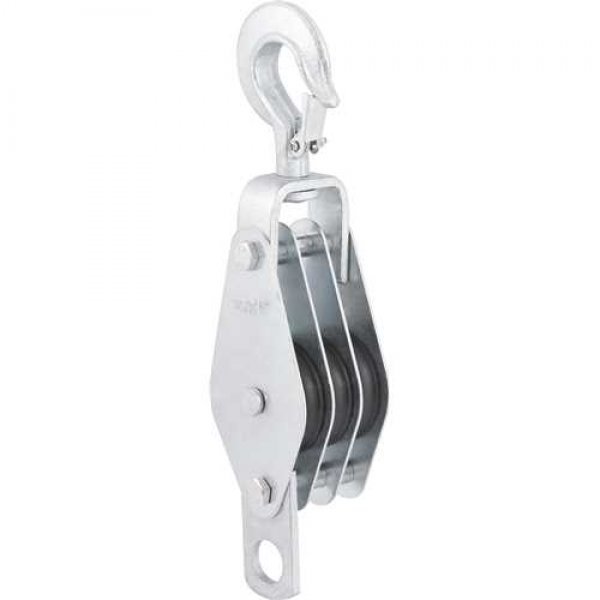 Indicado para elevacao de carga. Nao indicado para uso em andaimes de construcao civil. Nao utilizar cabo de aco. Fator de seguranca 2:1. Possui acabamento zincado, proporcionando maior resistencia a oxidacao/corrosao, gancho com trava proporcionando maior seguranca e polias de nylon de alto impacto proporcionando maior durabilidade. Conteudo da Embalagem: 1 par de moitao/cadernal. Detalhes Tecnicos: Material do gancho:Aco estampado Capacidade maxima de carga:970 kgf Diametro externo da roldana:60,0 mm Diametro max. da corda:1/2" (12,7 mm) No de roldanas:3 Tipo do gancho:Com trava de seguranca Massa aproximada (peso):2,1 kg