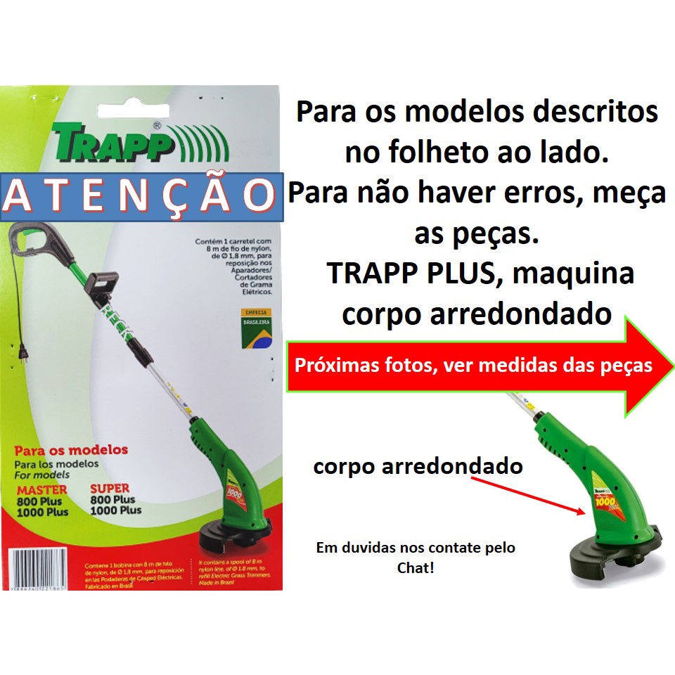 Mola Para Aparador Trapp Plus MASTER 800 MASTER 1000 SUPER 8000 SUPER 1000 Especificações Técnicas: Produto: Conjunto Carretel 01 MOLA A T EN Ç Ã O: confirmar o modelo pelas fotos e medidas , em duvidas nos contate pelo chat. Ferramenta: Aparador de grama; Marca: Trapp Modelo: MASTER 800 /MASTER 1000 /SUPER 8000 /SUPER 1000 - Instruções de uso Geral 1 - Retire a tampa 2 - Retire o refil 3 - Retire a mola . 4 - Retire a porca M6 do eixo com uma chave, e em seguida saque a base do carretel . 5 - Usar a sequência inversa para instalar o novo conjunto carretel, cuidando para não perder o pino trava e encaixa-lo no rebaixo da base do carretel . EM DUVIDAS PERGUNTE! - Produto original de fábrica, testado e aprovado