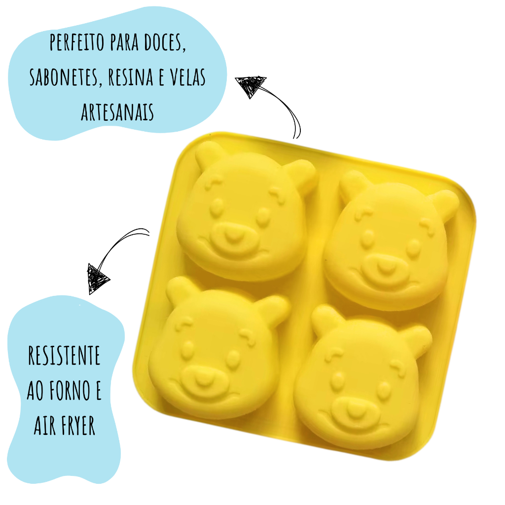 **São modelos de cores sortidas, de acordo com a disponibilidade do estoque.** **Por favor, fiquem atentos as medidas nas imagens** Embalagem compõe: 1 - Forma/Molde de silicone com 4 cavidades em formato de cabeça de urso – 14cm(C) x 14,5cm(L) x 3cm(A) CARACTERÍSTICAS: - Cacidade de 50g por cavidade (Aproximadamente) - Temperatura Suportada de -40°C a 230°C. - Resistente ao forno, microondas e air fryer. - Livre de BPA. - Fabricada em silicone resistente de grau alimentício. - Dobrável e Moldável. - Lavável e reutilizável. - Macio e fácil de usar. - Fácil de desenformar. - Material Antiaderente. * Garantia de 90 dias. * Produtos a Pronta Entrega. * Envio em 24h * Os produtos são verificados antes do envio.