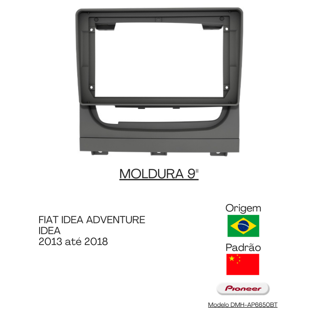A Moldura 9 polegadas para Fiat Idea, é fabricada pela Fiamon, que tem hoje o melhor acabamento entre as molduras comercializadas, e por isso escolhemos a maca Fiamon para fornecer as melhores molduras no mercado aos nossos clientes. Praticamente todas as molduras são fabricadas pela própria Fiamon, com garantia de qualidade e acabamento já demonstrado pelos anos de sucesso nas vendas. Mantenha a originalidade e qualidade no acabamento de seu veículo, escolha Fiamon." Características Gerais do Produto: • Cor: Grafite • Marca: Fiamon • Material produto: Feita em ABS; Ótima qualidade; Perfeito acabamento • Origem: Brasil • Padrão Aparelho: Chinês • Padrão Tela: 9" - Chinês Garantia: • 3 meses