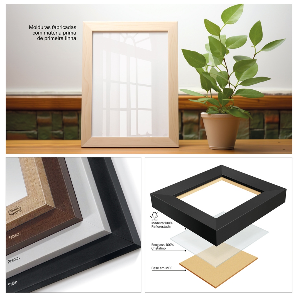"Nossas molduras são fabricadas com madeira Imunizada 100% livre de imperfeições, com acabamento laqueado, e vidro cristalino especial para quadros. É finalizado com fundo em madeira EUCATEX, que pode ser facilmente retirado graças ao seu sistema de aberturas com flexipontas, para que você possa trocar o conteúdo sempre que desejar, além disso, graças ao prático pendurador móvel, você pode posicionar seu quadro tanto na vertical quanto na horizontal! Nossos quadros e molduras são fabricados, montados e acabados em processo industrial, com máquinas, equipamentos de ultima tecnologia e profissionais capacitados, garantindo uma maior qualidade, durabilidade e melhor experiência. Quando prontos, cuidamos para que sejam enviadas e transportadas em segurança até você. Colocamos cantoneiras de papelão, envolvemos com plástico bolha e embalamos em caixa de papelão micro ondulado, assim garantimos a integridade do seu quadro ou moldura. >>> ESPECIFICAÇÕES DO PRODUTO <<< Especificações técnicas: • 1 quadro c/ moldura formato: 46x64cm (imagem A2 – 40x60cm) - ACOMPANHA ACETATO 100% CRISTALINO PRÓPRIO PARA O SEGMENTO. - Madeira Imunizada 100% livre de imperfeições, com acabamento laqueado. - Cor da moldura como disposto no anúncio. - Fundo em madeira EUCATEX. - Caixa Alta 2 cm de Profundidade. - Selo Ecologicamente Correto certificado por FSC. - Acabamento com fechamento e corte com maquinário profissional. - Embalagem segura para que receba seu produto em perfeito estado. - Garantia de produto de qualidade ou seu dinheiro de volta. - Segurança da compra com vendedor de ótima qualificação e profissional no ramo de atuação. As peças combinam com diversos tipos de decoração e acrescentam estilo e sofisticação a qualquer ambiente. Graças ao seu material resistente e ao tom neutro os quadros são extremamente versáteis, podendo ser usados para decorar salas de estar, jantar, quartos e até mesmo cozinhas e home-offices. O design clean, moderno e sofisticado do produto deixam o seu espaço muito mais agradável e aconchegante. PERGUNTAS FREQUENTES EMBALAGEM As embalagens que usamos são personalizadas para a dimensão dos quadros, possuem proteção com camada dupla de papelão garantindo que o produto não chegue com defeito à você. Nosso plástico bolha é do tipo “almofada”, ideal para proteção, este plástico serve como uma segunda camada em caso de queda da caixa. INSTALAÇÃO A instalação é feita da forma tradicional, utilizando parafusos e buchas. Nós enviamos este produto com um pendurador móvel para que você possa alterar a orientação do quadro conforme desejar. LIMPEZA A limpeza dos quadros pode ser feita com pano úmido, nosso material é a prova d’água e nossas molduras são imunizadas com proteção anti-mofo. VIDRO Nossas molduras são vendidas com acetato, também possuímos a opção com vidro, se preferir esta opção basta nos chamar que iremos te auxiliar. O vidro que utilizamos é 100% cristalino de alta qualidade, ele é responsável por garantir a maior durabilidade da imagem que irá compor este quadro. QUADROS QUEBRADOS Em alguns RARÍSSIMOS casos os quadros podem chegar quebrados até você, não precisa se preocupar!! Nós iremos te auxiliar da melhor forma, garantindo que não fique desamparado, mas para que isso ocorra de forma mais rápida e sem burocracias nós pedimos que não abra uma reclamação no Mercado Livre, pois além de serem lentas, as reclamações também nos prejudicam, e muitas vezes por um problema que não fomos nós que causamos. Caso tenha interesse em algum tamanho diferente deste anúncio é só nos chamar que nossa equipe está sempre à disposição para te auxiliar.