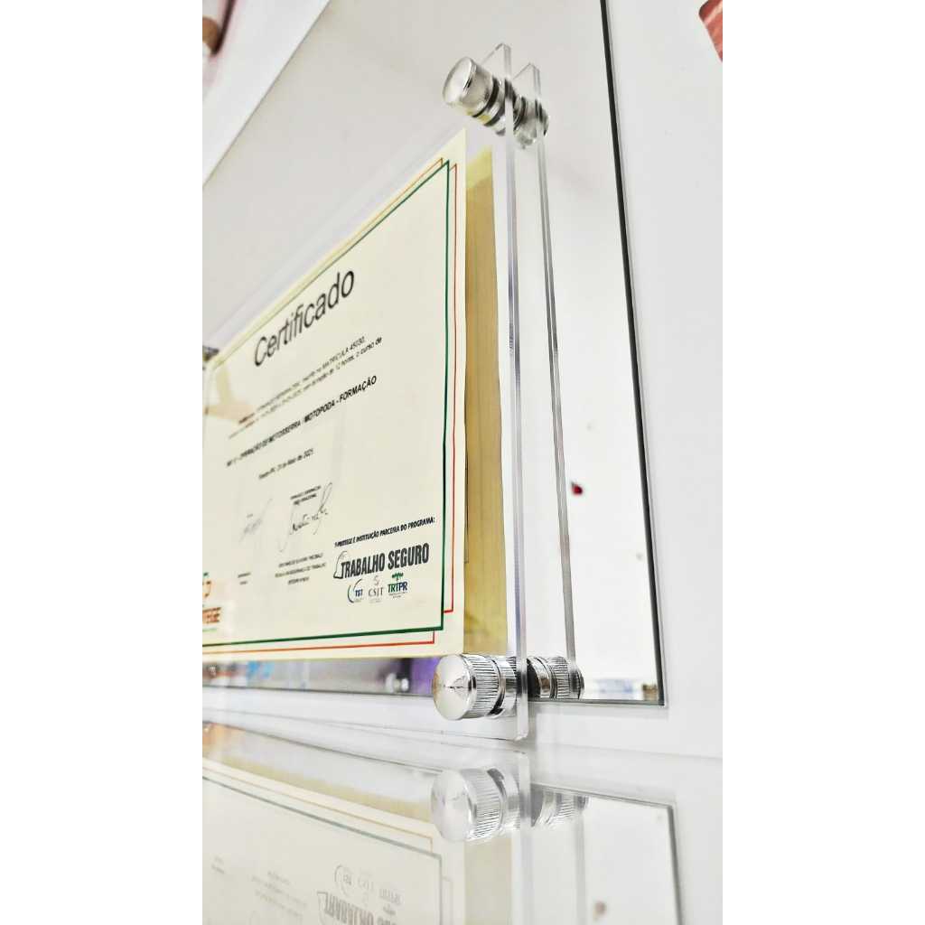 Moldura Acrílica Porta Diploma TAMANHO A3 OU 30X45 CM– Moderna, Elegante e Profissional Exiba seus certificados, diplomas, alvarás, licenças e documentos importantes com sofisticação! Nossa moldura em acrílico cristal é ideal para quem busca elegância e durabilidade na apresentação de documentos em ambientes profissionais, escritórios, consultórios, comércios e residências. Características do Produto: Material: Acrílico cristal de alta transparência Espessura: 2 placas de acrílico formando 5 mm no total Tamanhos compatíveis: Papel A4 (42x29,7 cm) ou 30X45 CM Fixação: Parafusos cromados inclusos (estilo standoff), ou suporte adesivo, também incluso Instalação: Pode ser fixado em paredes de alvenaria, madeira ou gesso (buchas e parafusos acompanham) Uso: Ideal para diplomas, certificados, alvarás, avisos e sinalizações Destaques: Aparência clean e moderna Realce do documento com efeito flutuante Fácil troca do conteúdo Proteção contra umidade e desgaste