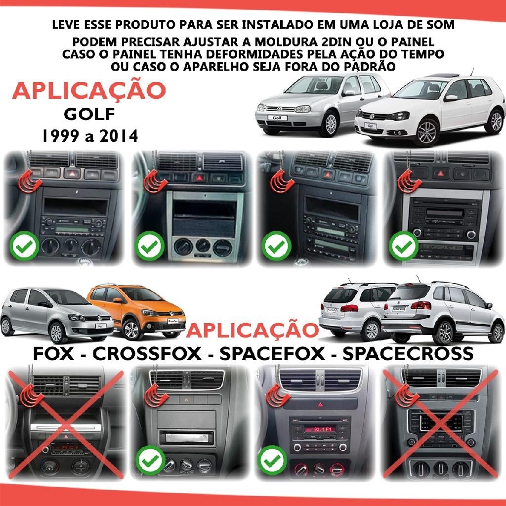 Carroussel Auto apresenta: Moldura com visual flutuante para instalar uma multimídia de 9 ou de 10 polegadas 2din ou 1din! #LEVE ESSE PRODUTO PARA SER INSTALADO EM UMA LOJA DE SOM# Podem precisar ajustar a moldura 2din OU o painel, caso o painel tenha deformidades pela ação do tempo ou caso o aparelho seja fora do padrão #APLICAÇÃO# Para confirmar se serve no painel, consulte a(s) foto(s) APLICAÇÃO - VW GOLF: 1999, 2000, 2001, 2002, 2003, 2004, 2005, 2006, 2007, 2008, 2009, 2010, 2011, 2012 e 2013 - VW POLO HATCH E SEDAN: 2002, 2003, 2004, 2005, 2006, 2007, 2008, 2009, 2010, 2011, 2012, 2013 e 2014 - VW FOX: 2010, 2011, 2012, 2013 e 2014 (modelo G2) - VW CROSSFOX: 2011, 2012 e 2013 - VW SPACEFOX: 2011, 2012 e 2013 - VW SPACE CROSS: 2012 e 2013 - VW BORA: 2000, 2001, 2002, 2003, 2004, 2005, 2006, 2007, 2008, 2009, 2010 e 2011 #APARELHOS COMPATÍVEIS# - Multimídias 2din e 1din que a tela é de 9 ou de 10 polegadas #CARACTERÍSTICAS# - Marca: Ludovico - Código do fabricante: 7.307.P - A multimídia fica flutuando fora do painel com maior destaque da tela, conforme foto 02 - Cor: Preto* - Garantia de fábrica: 90 dias #CONTEÚDO DA EMBALAGEM# - 1 Moldura para multimídia de 9 ou 10 polegadas 2din e 1din - 4 espumas antirruído para uma melhor fixação na família Fox #OBSERVAÇÕES# - NÃO acompanha parafusos para fixação do aparelho nesta moldura - NÃO acompanha o chaveiro vermelho, foto meramente decorativa - Leve esse produto para ser instalado em uma loja de som *Pode ter alguma diferença de cor comparada ao painel pela ação do tempo