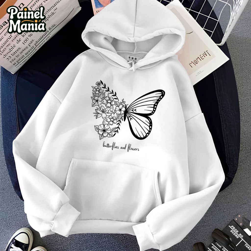Moletom Blusa de Frio Butterflies and Flowers Bolso Canguru Cordão Capuz 5281