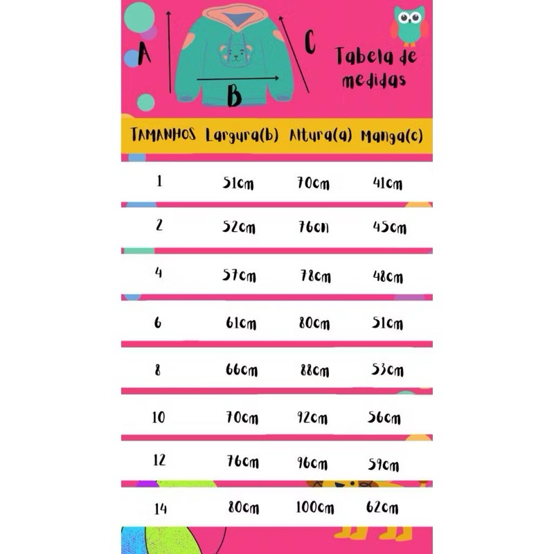Olá, que bom ter você aqui! Seja muito Bem vindo!! 📦Produtos à pronta entrega, envio realizado em menos de 24 horas úteis Ficou fácil e aconchegante pro seu pequenino enfrentar o inverno com o nosso Moletom Infantil Estampado para Inverno!! Fabricado com materiais de alta qualidade para que assim garanta o máximo conforto para qualquer que seja a ocasião. Inverno ou meia estação. ✅MELHOR CUSTO BENEFÍCIO DO MERCADO. ENVIO SEGURO E IMEDIATO! Com uma tendência de estilo minimalista, designer PREMIUM o moletom permite oferecer um visual clean e versátil. ✅ DETALHES DO MOLETOM INFANTIL: >> Modelo: Com Capuz >> Modelagem: Tradicional com ajustes Premium >> Disponivel nos Tamanhos: >> Tecido: Moletom Flanelado >> Composição: 58% Algodão e 42% Poliéster >> Estampa: DTF (o desenho é impresso em um papel especial sublimatico com uma tinta própria, depois a tinta recebe micropartículas de Poliamida. Após impressa, ela é prensada em uma prensa térmica, chegando a altas temperaturas. Nesse processo as partículas de Poliamida derretem e penetra no MOLETOM, aderindo totalmente.) ✅ MEDIDAS: ***** 1 ao 14 +++++ (ALTURA X LARGURA X COMPRIMENTO MANGAS) Tam. 1: ALTURA: 70cm LARGURA: 51cm MANGAS: 41cm Tam. 2: ALTURA: 76cm LARGURA: 52cm MANGAS: 46cm Tam. 4: ALTURA: 78cm LARGURA: 57cm MANGAS: 48cm Tam. 6: ALTURA: 80cm LARGURA: 61cm MANGAS: 61cm Tam. 8: ALTURA: 88cm LARGURA: 68cm MANGAS: 53cm Tam. 10: ALTURA: 92cm LARGURA: 70cm MANGAS: 56cm Tam. 12: ALTURA: 96cm LARGURA: 76cm MANGAS: 59cm Tam. 14: ALTURA: 100cm LARGURA: 80cm MANGAS: 62cm **as medidas podem sofrer variações de até 2cm** ✅ CUIDADOS COM O PRODUTO: ❕ Lave o MOLETOM com o lado da estampa pelo avesso, evite amassá-los com exagero. ❕ Não utilize alvejante, água quente, ou lavagem no Modo Pesado da sua máquina. ❕ Lave de preferência em águe fria, NÃO deixando o seu MOLETOM de molho. ❕ Estenda após a lavagem, com secagem de preferência na sombra. ❕ Passe sempre pelo avesso e utilize preferencialmente em uma tábua de passar roupa ✅INFORMAÇOES ADICIONAIS: => Garantia: Oferecemos a garantia em ate 7 dias úteis após a chegada do produto, quando há erro de fabricação do produto em mãos => Prazo de fabricação: Após a confirmação do pagamento, seu produto será fabricado em até 01 dia útil => Prazo de Postagem: A postagem do seu Produto será feita em até 1 dia útil após a confirmação do pagamento. => Prazo de Entrega: Após a postagem do seu pedido, será contado o prazo de entrega selecionado no momento da compra. => Código de Rastreamento: Assim que seu pedido for postado nos Correios. voce recebera o código de rastreamento por e-mail. *** Obs: Não postamos produtos aos sábados. *** ✅ DUVIDAS FREQUENTES: 1️⃣ O produto é novo? Sim. Todos nossos produtos são novos. Todos os Moletons ficam em estoque sem estampa. Assim que são vendidos, separamos o produto em nosso estoque e iniciamos o processo de fabricação, fazendo o envio do produto com cheirinho de novo. 2️⃣ Qual o prazo para postagem? A postagem de todos os pedidos são feitas em até 01 dia útil (24 horas úteis). Pedimos este prazo para prepararmos todas as etapas de compra (separação no estoque, corte e acabamento da estampa, embalagem e envio para os Correios). Caso tenha qualquer dúvida sobre o andamento da sua compra fique a vontade para enviar mensagens. Teremos prazer em responder => Se voce ainda tiver qualquer dúvida, envie sua pergunta, estaremos sempre a disposição para lhe responder da melhor forma possivel e claro, com bastante rapidez. ❓ ESTAMOS A DISPOSIÇÃO;!PERGUNTE SEMPRE QUE FOR NECESSÁRIO