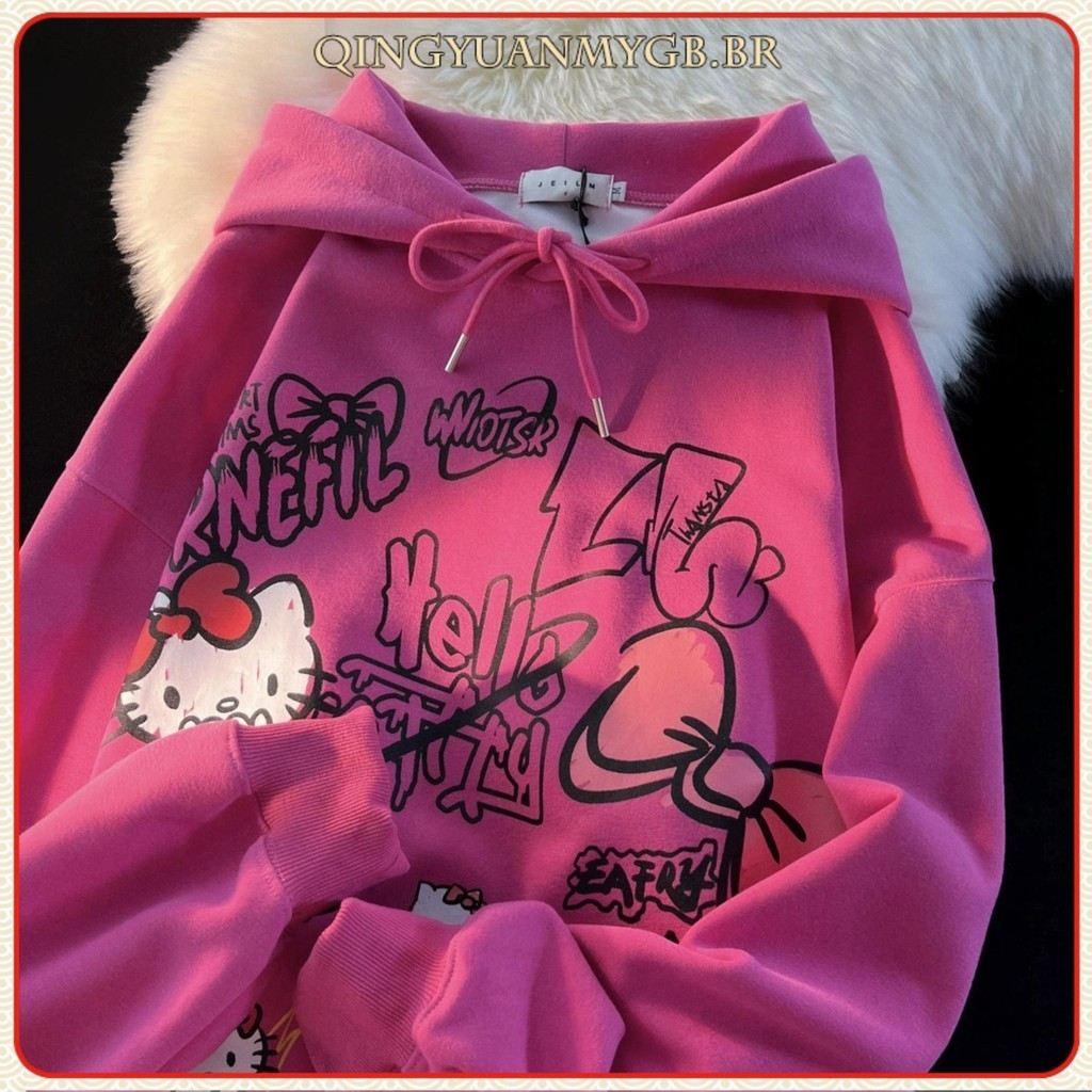 Moletom Canguru Unissex Desenho Animado Japonês Bonitinho Hello Kitty Moda Casual Maré