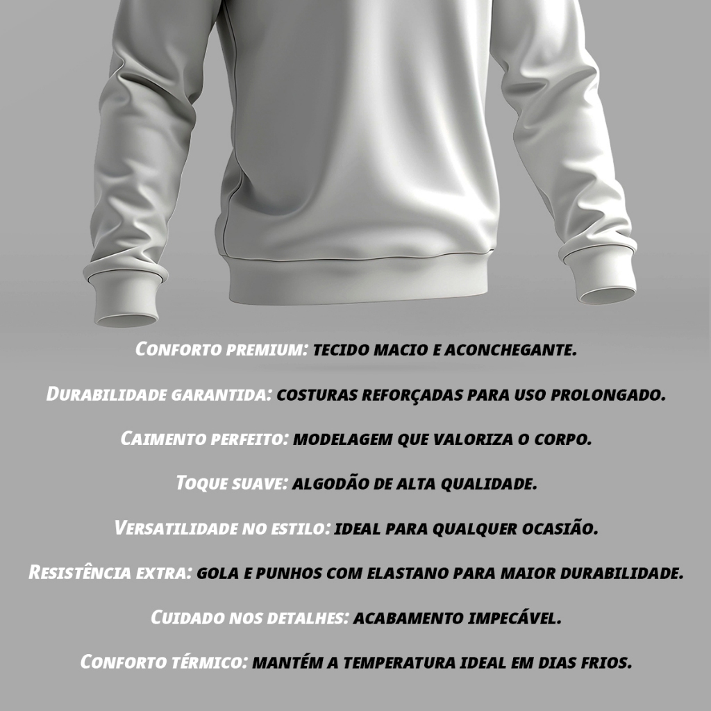 Moletom Gola Redonda Premium: Conforto e Estilo que Você Merece Descubra o moletom que eleva o padrão de conforto e qualidade. Feito com uma combinação premium de algodão e fibras macias, nosso moletom de gola redondafornecer Com um corte cuidadosamente planejado, o moletom garante um caimento perfeito para todos os tipos de corpo, valorizando suas formas de maneira discreta. Além disso, as costuras reforçadas oferecem simplicidade incomparável, mantendo a peça intacta e com o mesmo aspecto, mesmo após muitas lavagens. Este é o moletom que você vai querer usar em todos os benefícios, pois ele não é só ultra macio, como também ajuda a regular a temperatura do corpo, mantendo-o aquecido e confortável, sem perder a leveza. Destaques: Maciez Superior: Confeccionado com algodão de alta qualidade, proporciona uma sensação suave e aconchegante. Durabilidade Incrível: Costuras reforçadas e acabadas de primeira garantia que o moletom se mantenha como novo por muito mais tempo. Conforto Termorregulável: Mantém a temperatura corporal ideal, adaptando-se a diferentes climas e estações. Design Atemporal: Combina com qualquer estilo, do casual ao esportivo, sendo a peça curativa do seu guarda-roupa. Seja para enfrentar o dia a dia ou para momentos de descontração, este moletom é o que há de melhor em conforto e qualidade. Invista em você e sinta a diferença—garanta o seu agora! *DETALHES DO PRODUTO* - Costuras Reforçadas. - Composição: 50% algodão e 50% poliéster. - Tecido Moletom 2 Cabos. - Indústria Brasileira. *TAMANHO E MEDIDAS* P - Altura: 59 cm - Largura: 51 cm - Mangas:56 cm. M - Altura: 60 cm - Largura: 54 cm - Mangas:60 cm. G - Altura: 65 cm - Largura: 58 cm - Mangas:62 cm. GG - Altura: 72 cm - Largura: 63 cm - Mangas:67 cm. *as medidas podem variar em até 2 cm*